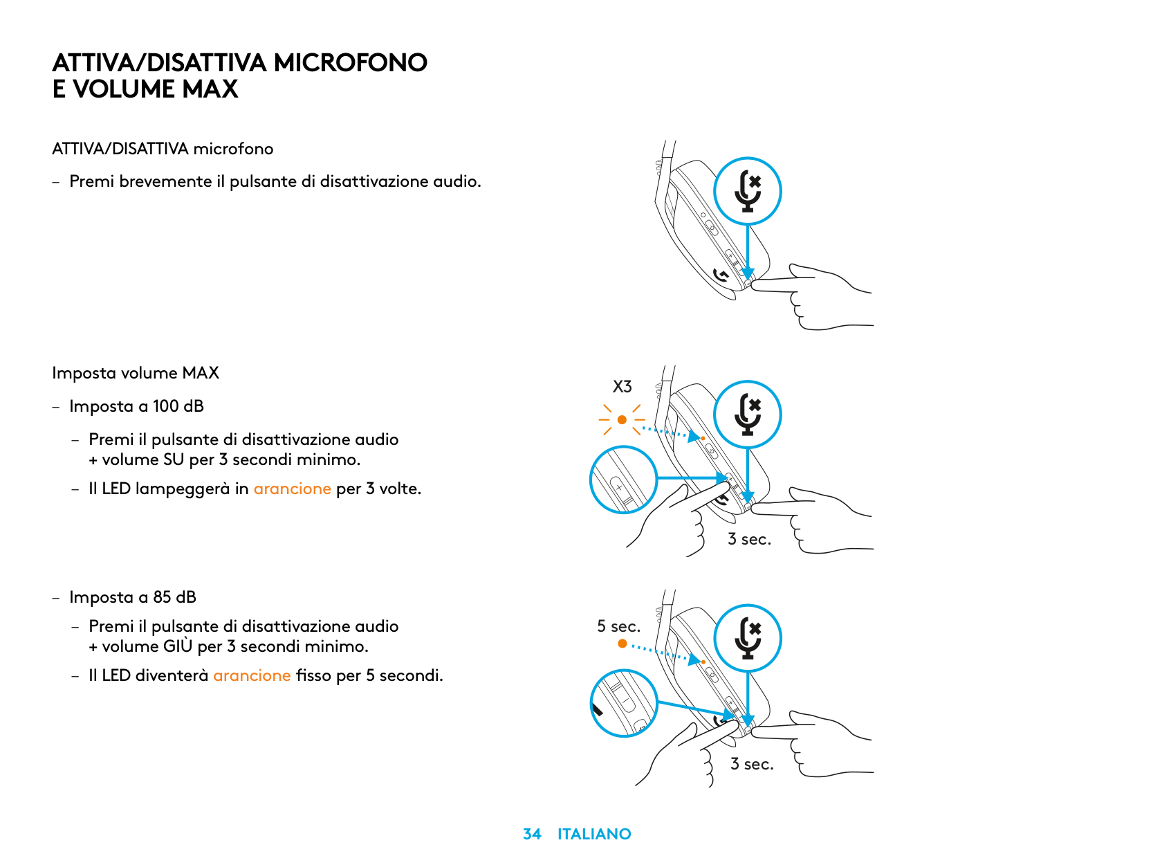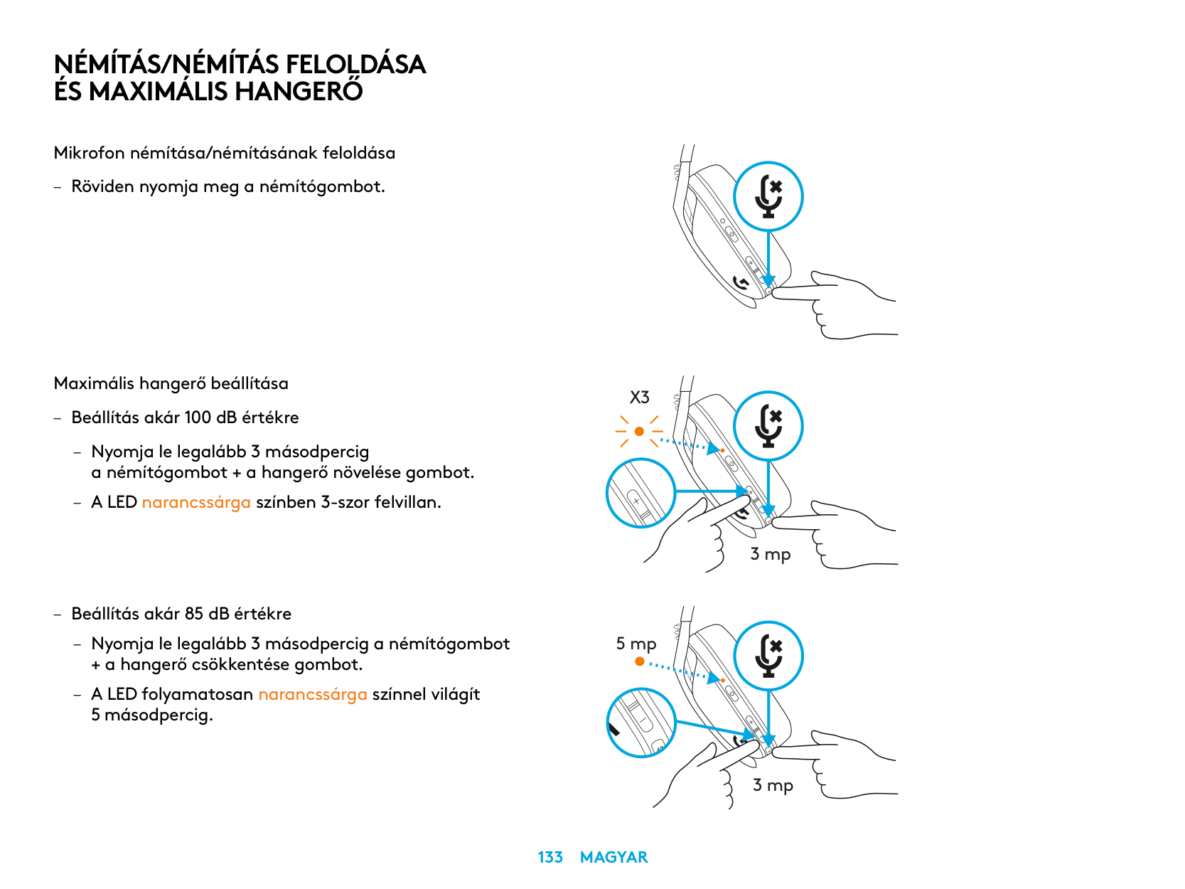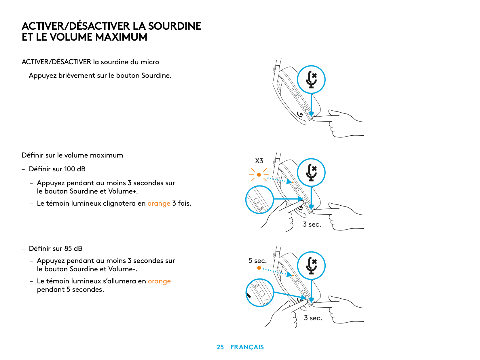 MUTE / UNMUTE microphone – Short press on the Mute button. Set Max Volume – Set to 100 dB – Press 3 seconds or longer Mute button + Volume UP. – LED will flash orange 3 times. – Set to 85 dB – Press 3 seconds or longer Mute button + Volume DOWN. – LED will turn solid orange for 5 seconds.X3