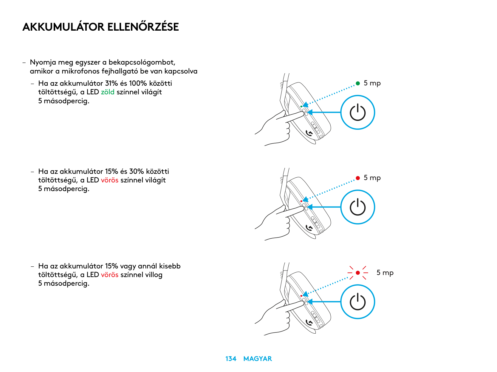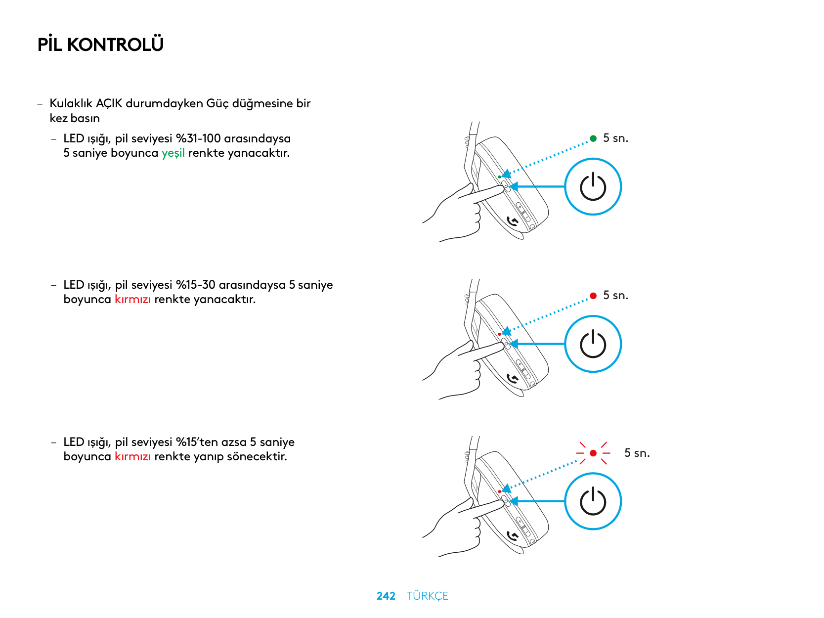 – Kulaklık AÇIK durumdayken Güç düğmesine bir kez basın – LED ışığı, pil seviyesi %31-100 arasındaysa 5 saniye boyunca yeşil renkte yanacaktır.Pi̇l Kontrolü