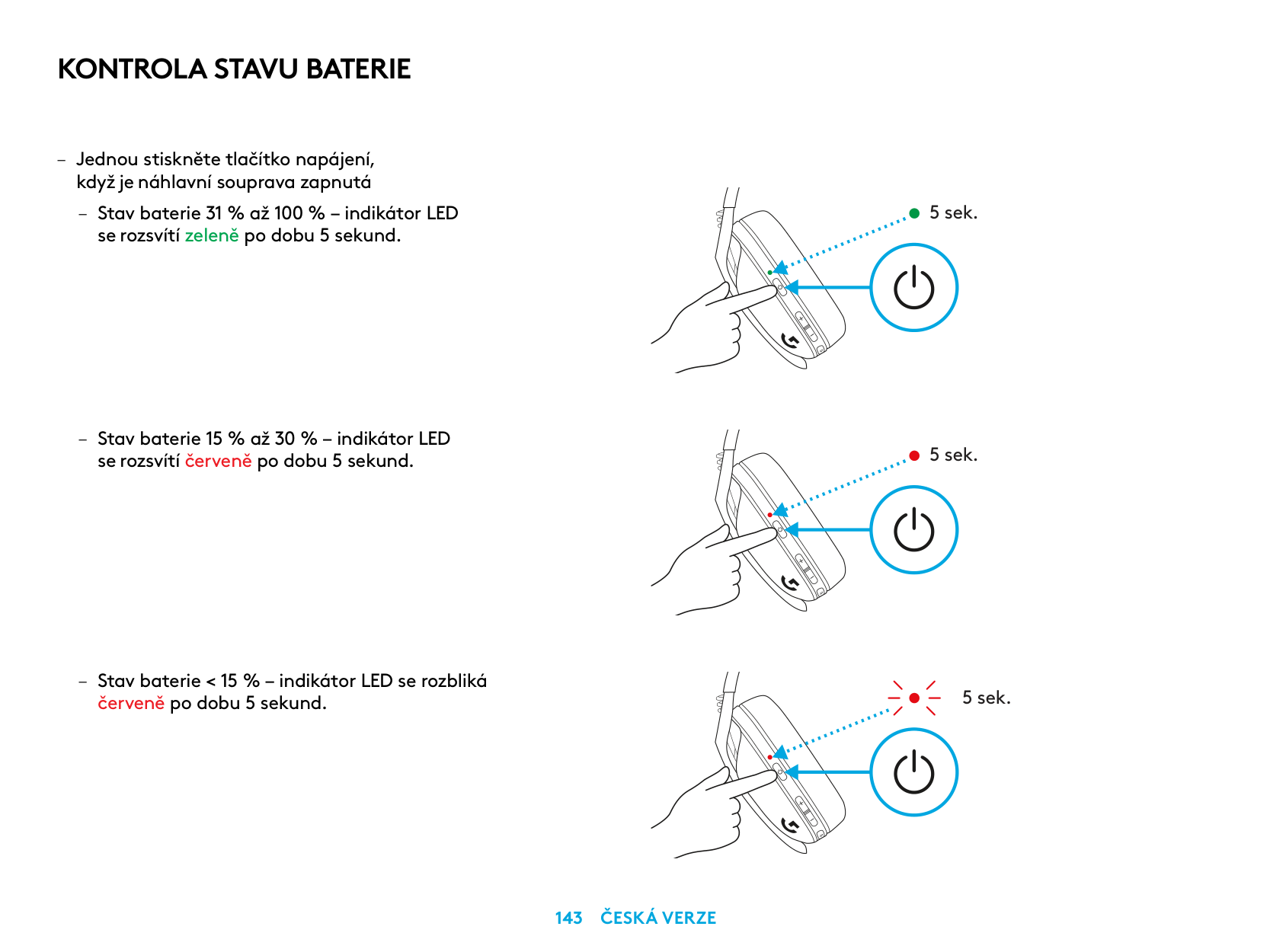 Single press the Power button when the headset is on. If battery is 31-100%, the LED shows green for 5 seconds. If battery is 15-30%, the LED shows red for 5 seconds. If battery is below 15%, the LED flashes red for 5 seconds. (Page 8)