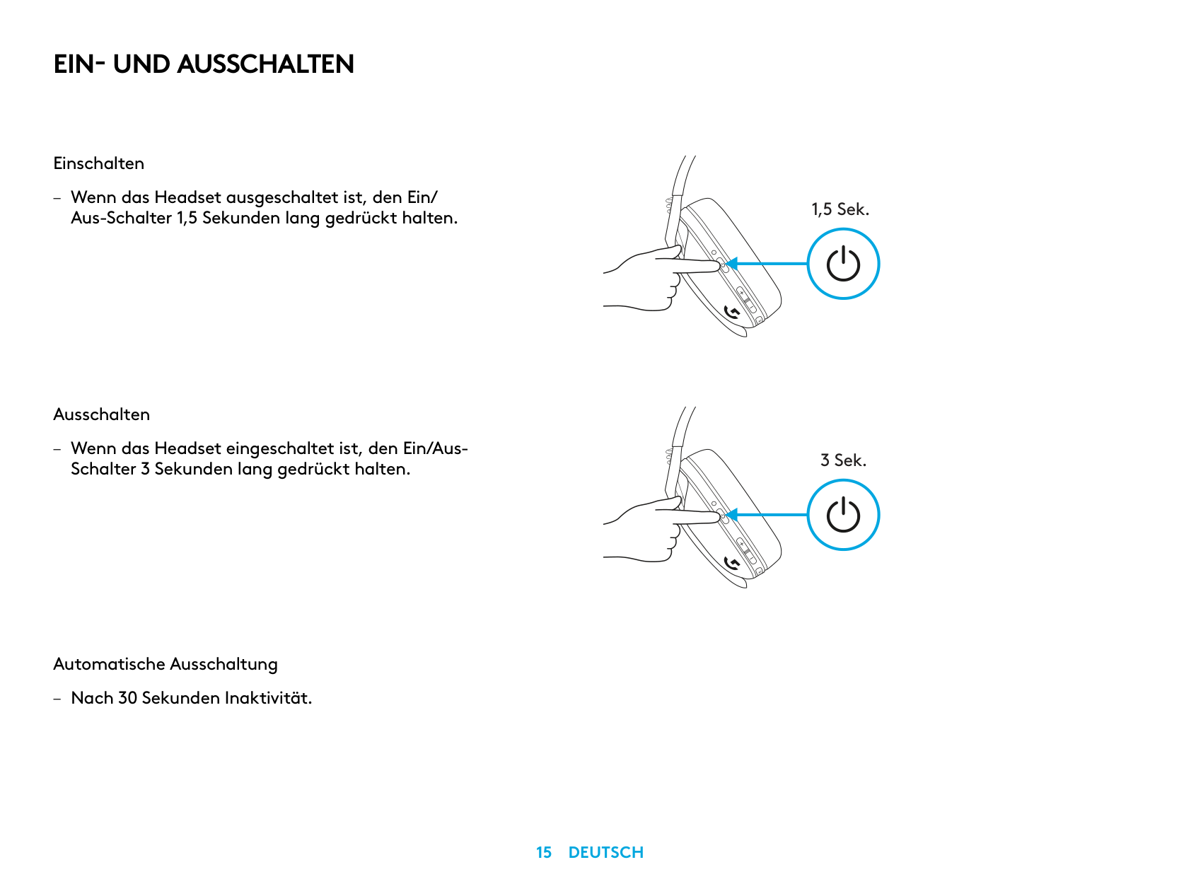 Einschalten – Wenn das Headset ausgeschaltet ist, den Ein/ Aus-Schalter 1,5 Sekunden lang gedrückt halten. Ausschalten – Wenn das Headset eingeschaltet ist, den Ein/Aus- Schalter 3 Sekunden lang gedrückt halten. Automatische Ausschaltung – Nach 30 Sekunden Inaktivität. 1,5 Sek. 3 Sek.Ein- Und Ausschalten