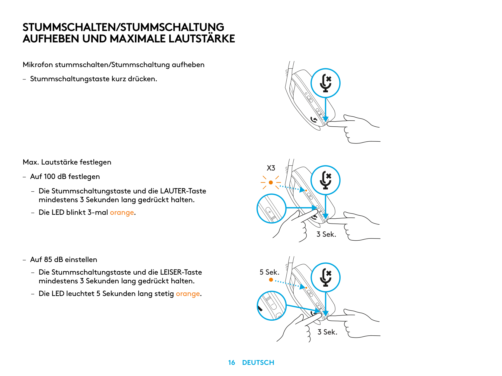 Mikrofon stummschalten/Stummschaltung aufheben – Stummschaltungstaste kurz drücken. Max. Lautstärke festlegen – Auf 100 dB festlegen – Die Stummschaltungstaste und die LAUTER-Taste mindestens 3 Sekunden lang gedrückt halten. – Die LED blinkt 3-mal orange. – Auf 85 dB einstellen – Die Stummschaltungstaste und die LEISER-Taste mindestens 3 Sekunden lang gedrückt halten. – Die LED leuchtet 5 Sekunden lang stetig orange.X3