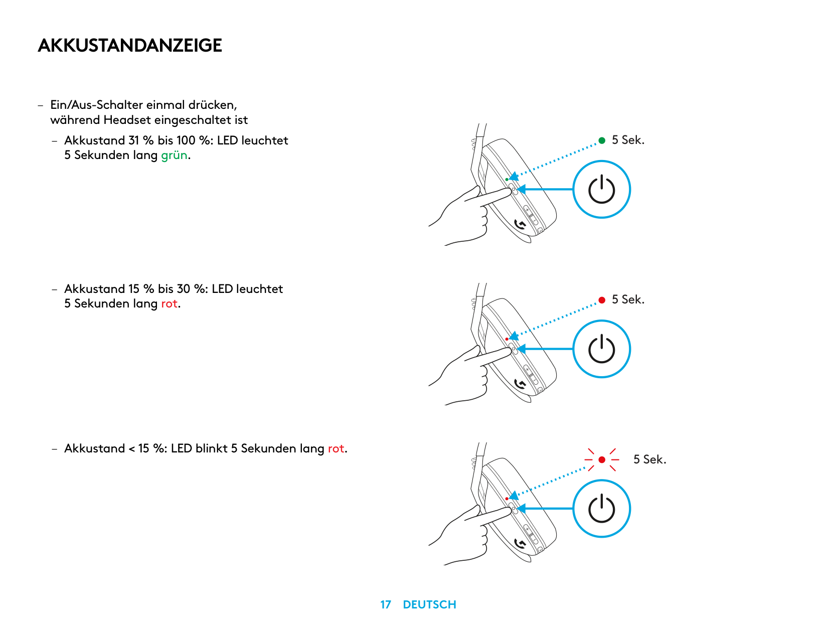 – Ein/Aus-Schalter einmal drücken, während Headset eingeschaltet ist – Akkustand 31 % bis 100 %: LED leuchtet 5 Sekunden lang grün.Akkustandanzeige