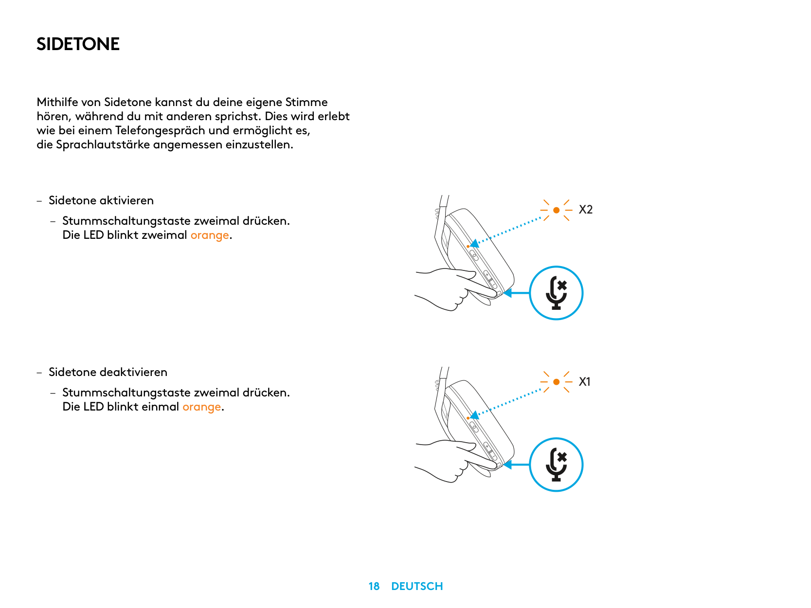 – Sidetone deaktivieren – Stummschaltungstaste zweimal drücken. Die LED blinkt einmal orange.X2
