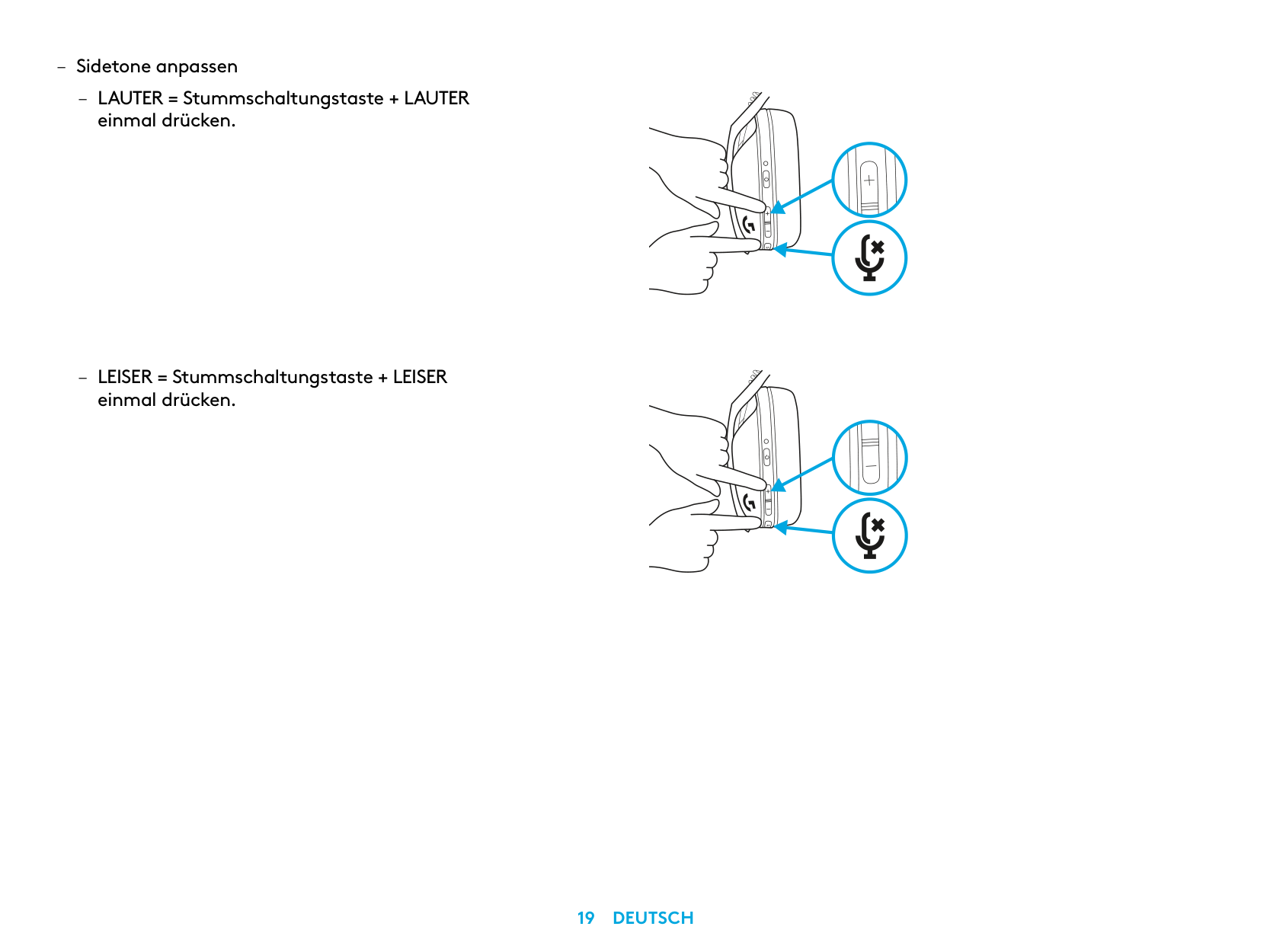 – Sidetone anpassen – LAUTER = Stummschaltungstaste + LAUTER einmal drücken. – LEISER = Stummschaltungstaste + LEISER einmal drücken.20 Deutsch
