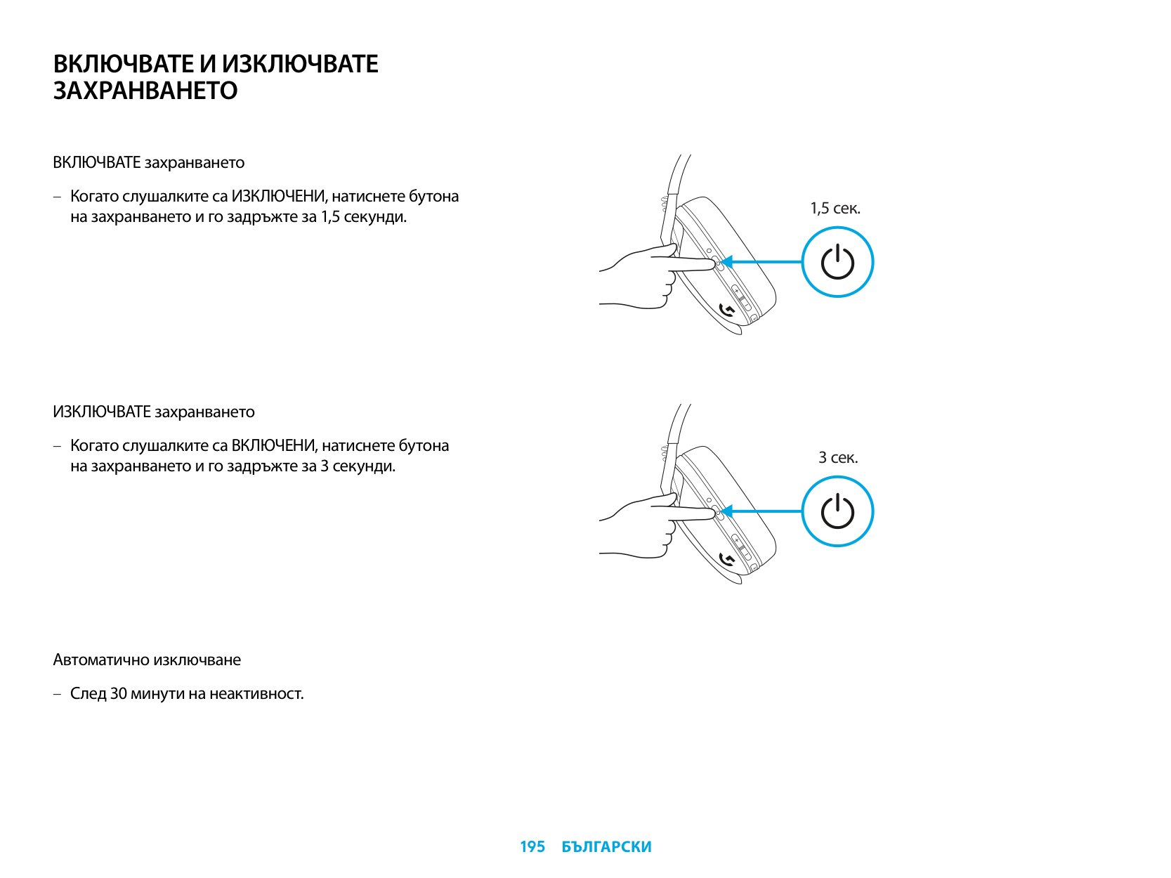 Pornirea – Apăsaţi butonul de alimentare timp de 1,5 secunde când căştile sunt oprite. Oprirea – Apăsaţi butonul de alimentare timp de 3 secunde când căştile sunt pornite. Oprirea automată – După 30 de minute de inactivitate. 1,5 sec. 3 sec.Pornirea Şi Oprirea