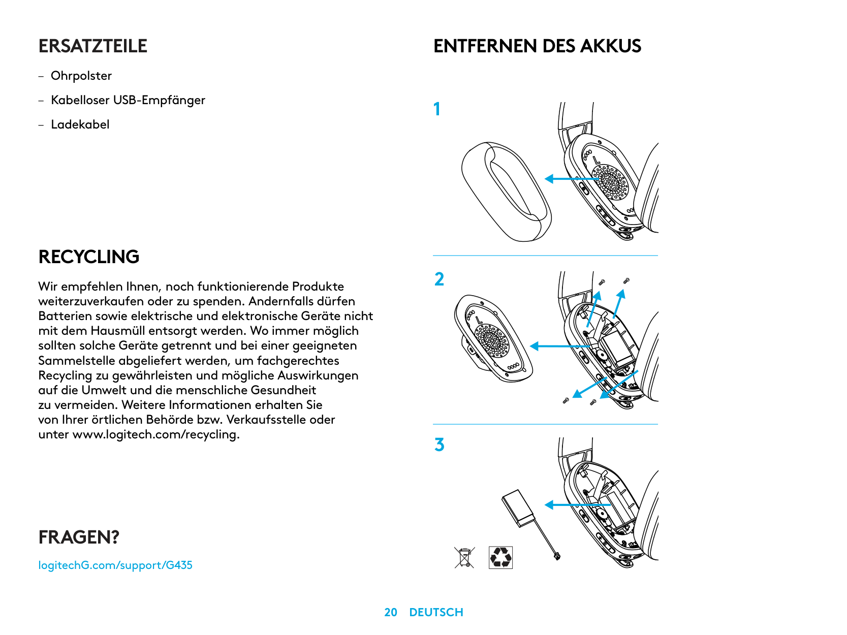 Wir empfehlen Ihnen, noch funktionierende Produkte weiterzuverkaufen oder zu spenden. Andernfalls dürfen Batterien sowie elektrische und elektronische Geräte nicht mit dem Hausmüll entsorgt werden. Wo immer möglich sollten solche Geräte getrennt und bei einer geeigneten Sammelstelle abgeliefert werden, um fachgerechtes Recycling zu gewährleisten und mögliche Auswirkungen auf die Umwelt und die menschliche Gesundheit zu vermeiden. Weitere Informationen erhalten Sie von Ihrer örtlichen Behörde bzw. Verkaufsstelle oder unter www.logitech.com/recycling.Ersatzteile