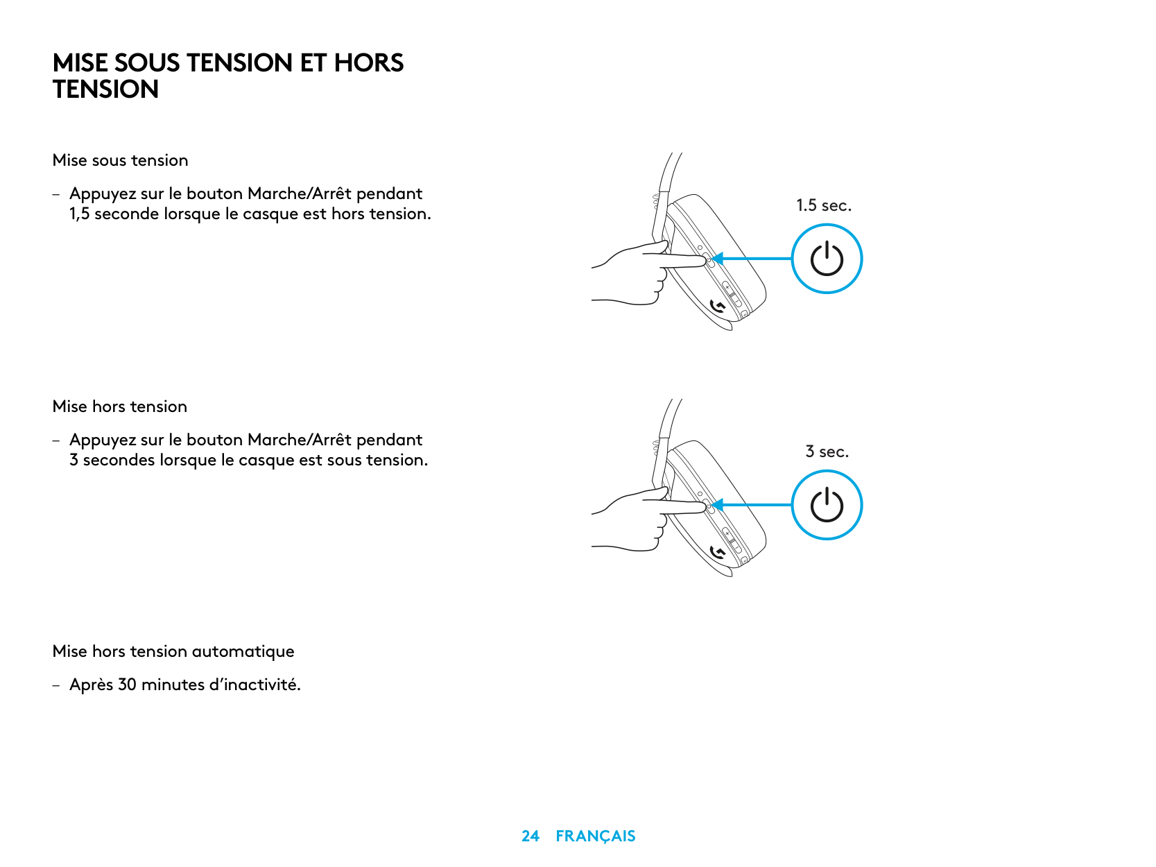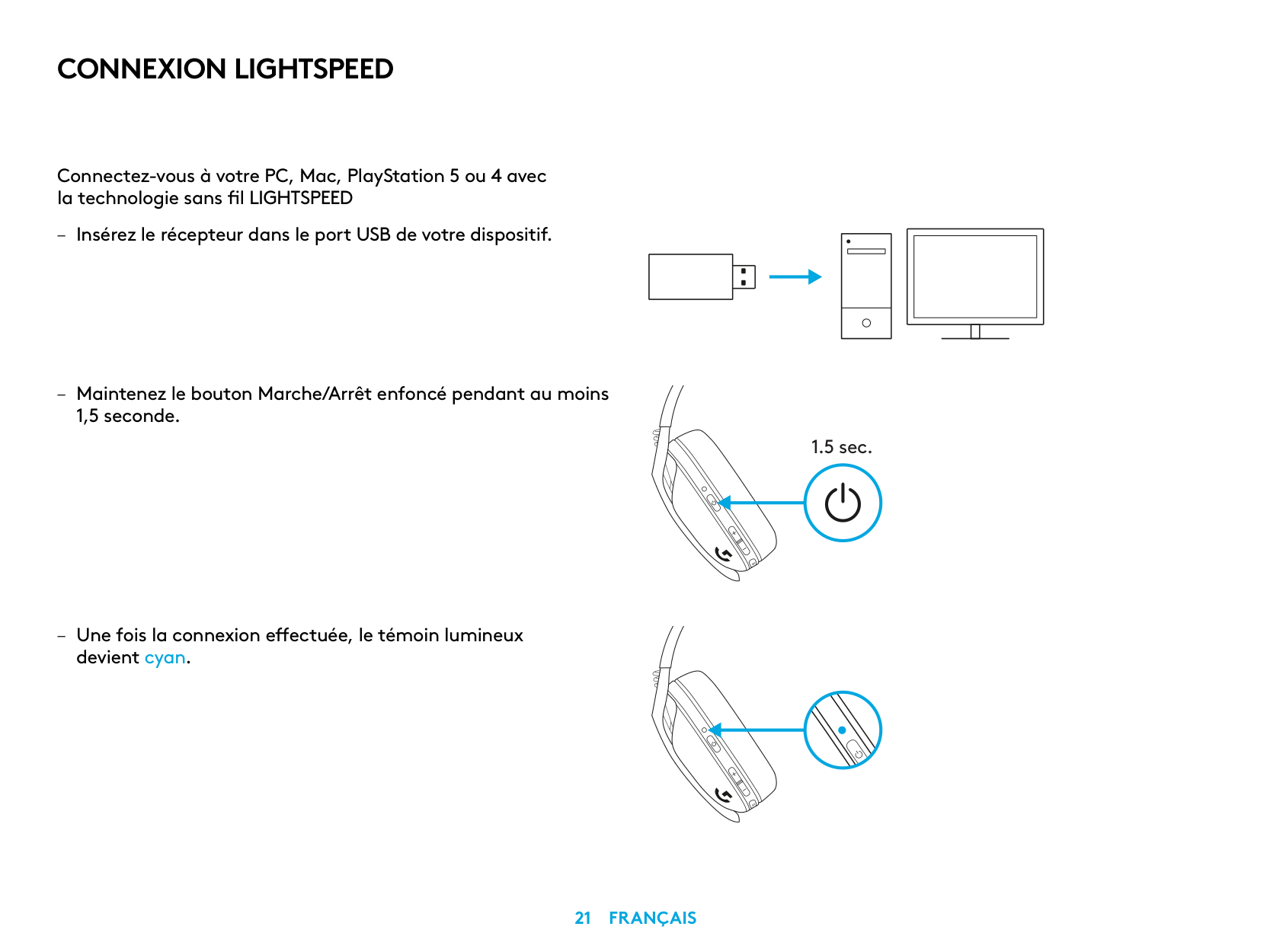 Connectez-vous à votre PC, Mac, PlayStation 5 ou 4 avec la technologie sans fil LIGHTSPEED – Insérez le récepteur dans le port USB de votre dispositif. – Maintenez le bouton Marche/Arrêt enfoncé pendant au moins 1,5 seconde. – Une fois la connexion effectuée, le témoin lumineux devient cyan. 1.5 sec.22 Français