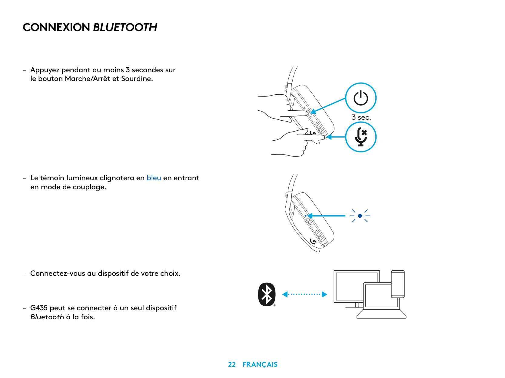 – Appuyez pendant au moins 3 secondes sur le bouton Marche/Arrêt et Sourdine. – Le témoin lumineux clignotera en bleu en entrant en mode de couplage. 3 sec. – Connectez-vous au dispositif de votre choix. – G435 peut se connecter à un seul dispositif Bluetooth à la fois.23 Français