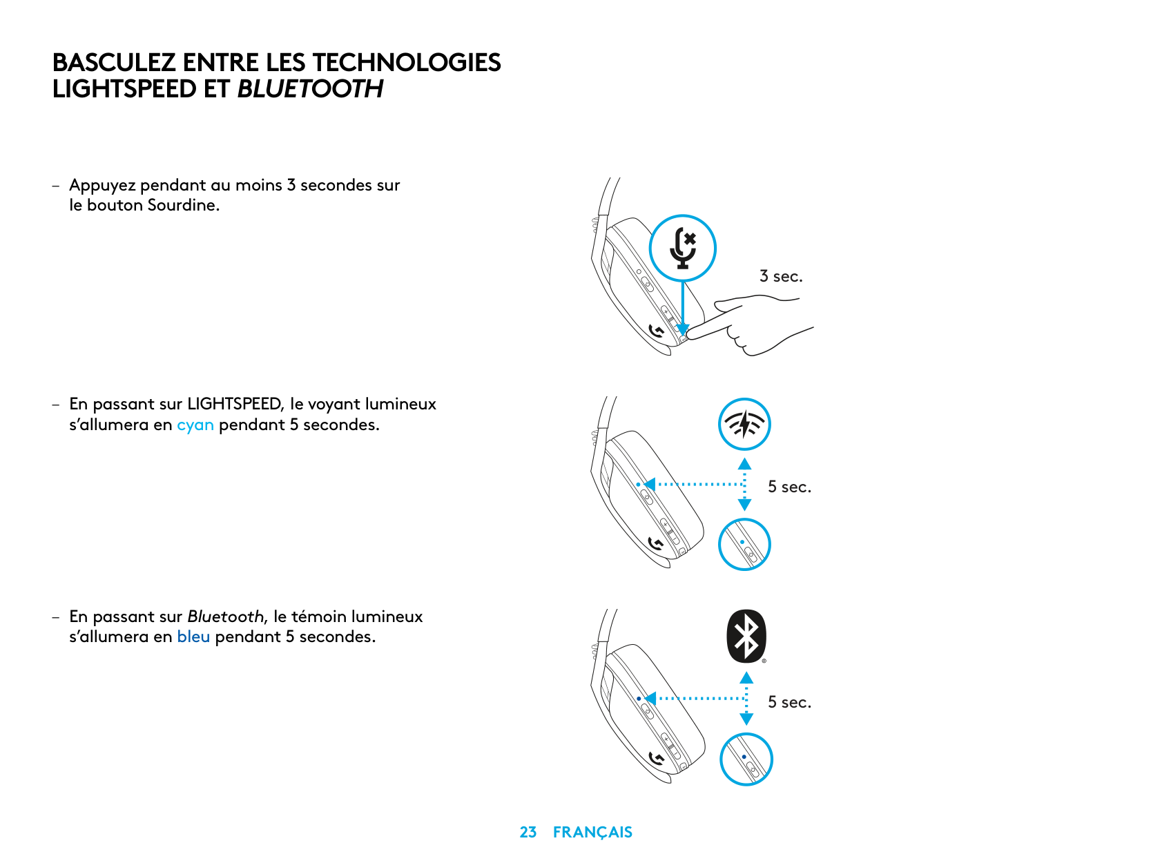 5 sec. 5 sec. – Appuyez pendant au moins 3 secondes sur le bouton Sourdine. – En passant sur LIGHTSPEED, le voyant lumineux s’allumera en cyan pendant 5 secondes. – En passant sur Bluetooth, le témoin lumineux s’allumera en bleu pendant 5 secondes. 3 sec.Basculez Entre Les Technologies