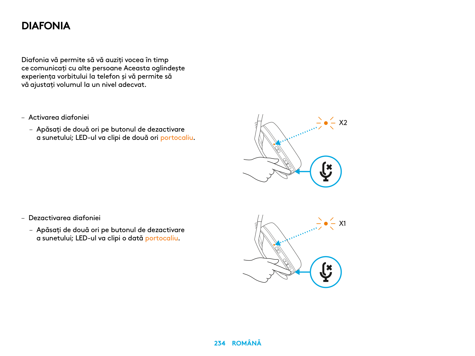 – Activarea diafoniei – Apăsaţi de două ori pe butonul de dezactivare a sunetului; LED-ul va clipi de două ori portocaliu. Diafonia vă permite să vă auziţi vocea în timp ce comunicaţi cu alte persoane Aceasta oglindeşte experienţa vorbitului la telefon şi vă permite să vă ajustaţi volumul la un nivel adecvat.Diafonia