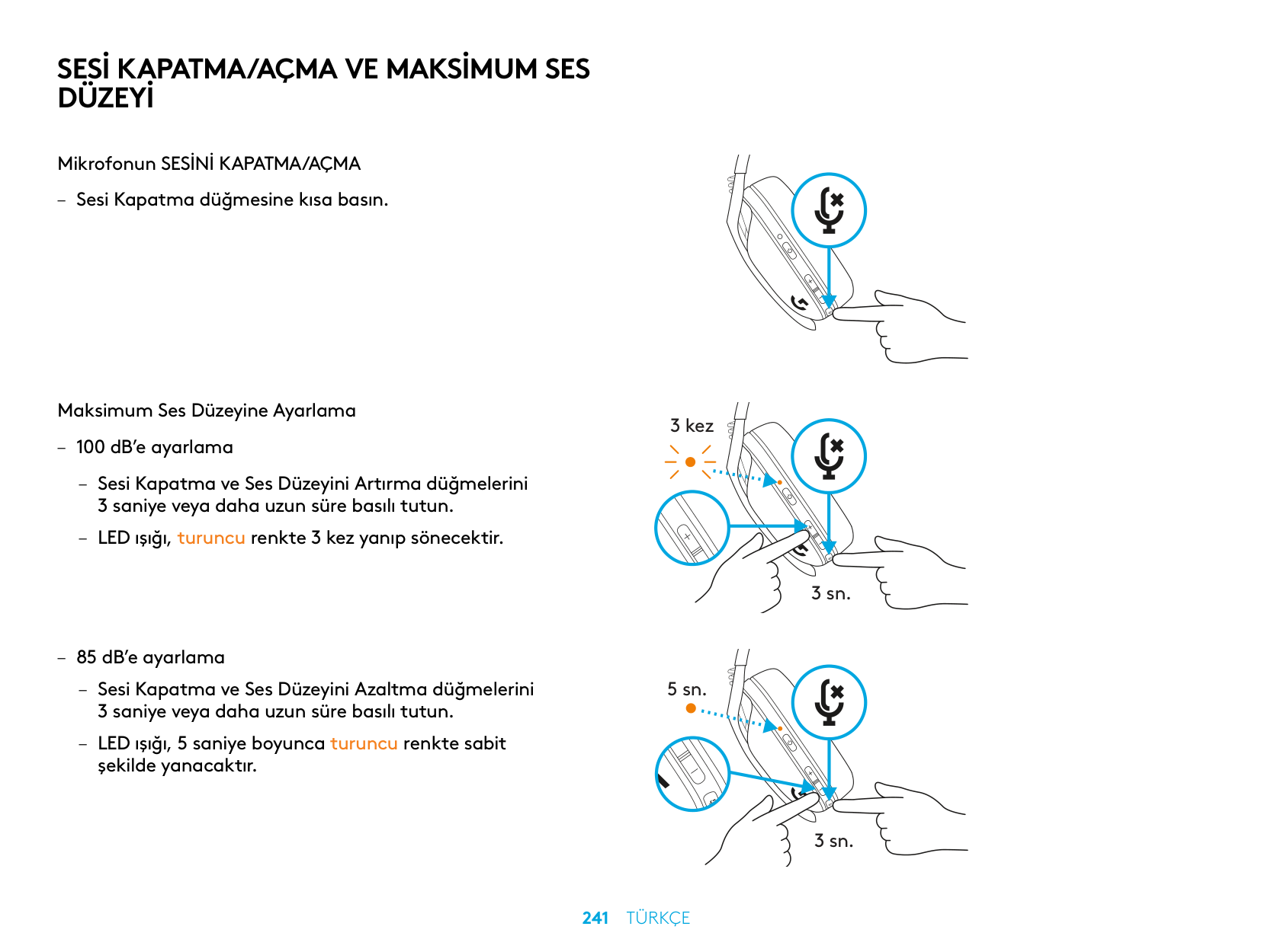 Mikrofonun SESİNİ KAPATMA/AÇMA – Sesi Kapatma düğmesine kısa basın. Maksimum Ses Düzeyine Ayarlama – 100 dB’e ayarlama – Sesi Kapatma ve Ses Düzeyini Artırma düğmelerini 3 saniye veya daha uzun süre basılı tutun. – LED ışığı, turuncu renkte 3 kez yanıp sönecektir. – 85 dB’e ayarlama – Sesi Kapatma ve Ses Düzeyini Azaltma düğmelerini 3 saniye veya daha uzun süre basılı tutun. – LED ışığı, 5 saniye boyunca turuncu renkte sabit şekilde yanacaktır. 3 kez 5 sn. 3 sn. 3 sn.Sesi Kapatma/Açma Ve Maksimum Ses