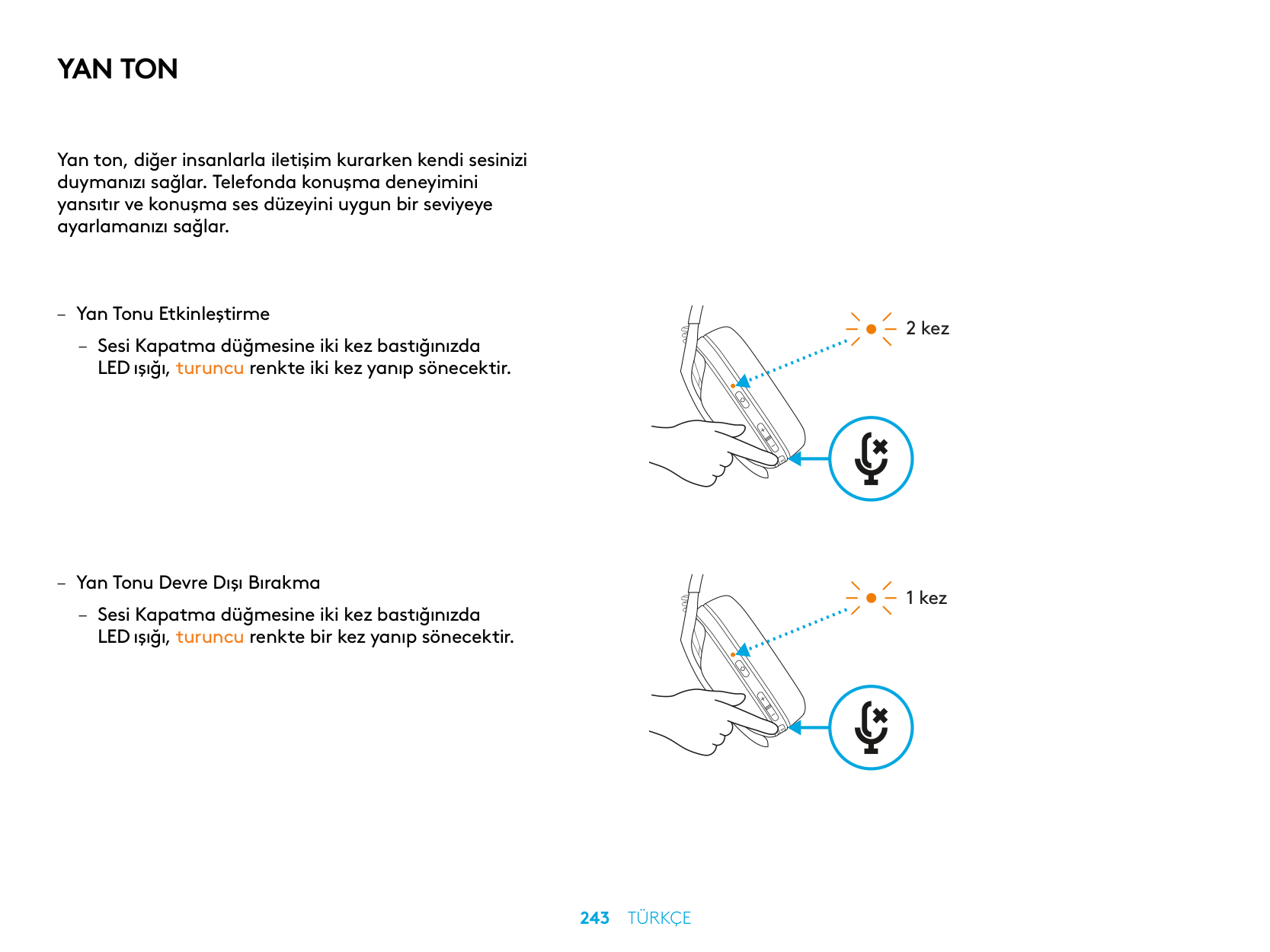 – Yan Tonu Etkinleştirme – Sesi Kapatma düğmesine iki kez bastığınızda LED ışığı, turuncu renkte iki kez yanıp sönecektir. Yan ton, diğer insanlarla iletişim kurarken kendi sesinizi duymanızı sağlar. Telefonda konuşma deneyimini yansıtır ve konuşma ses düzeyini uygun bir seviyeye ayarlamanızı sağlar.Yan Ton