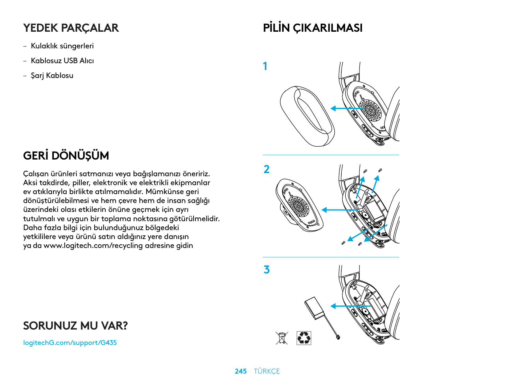 Çalışan ürünleri satmanızı veya bağışlamanızı öneririz. Aksi takdirde, piller, elektronik ve elektrikli ekipmanlar ev atıklarıyla birlikte atılmamalıdır. Mümkünse geri dönüştürülebilmesi ve hem çevre hem de insan sağlığı üzerindeki olası etkilerin önüne geçmek için ayrı tutulmalı ve uygun bir toplama noktasına götürülmelidir. Daha fazla bilgi için bulunduğunuz bölgedeki yetkililere veya ürünü satın aldığınız yere danışın ya da www.logitech.com/recycling adresine gidinYedek Parçalar