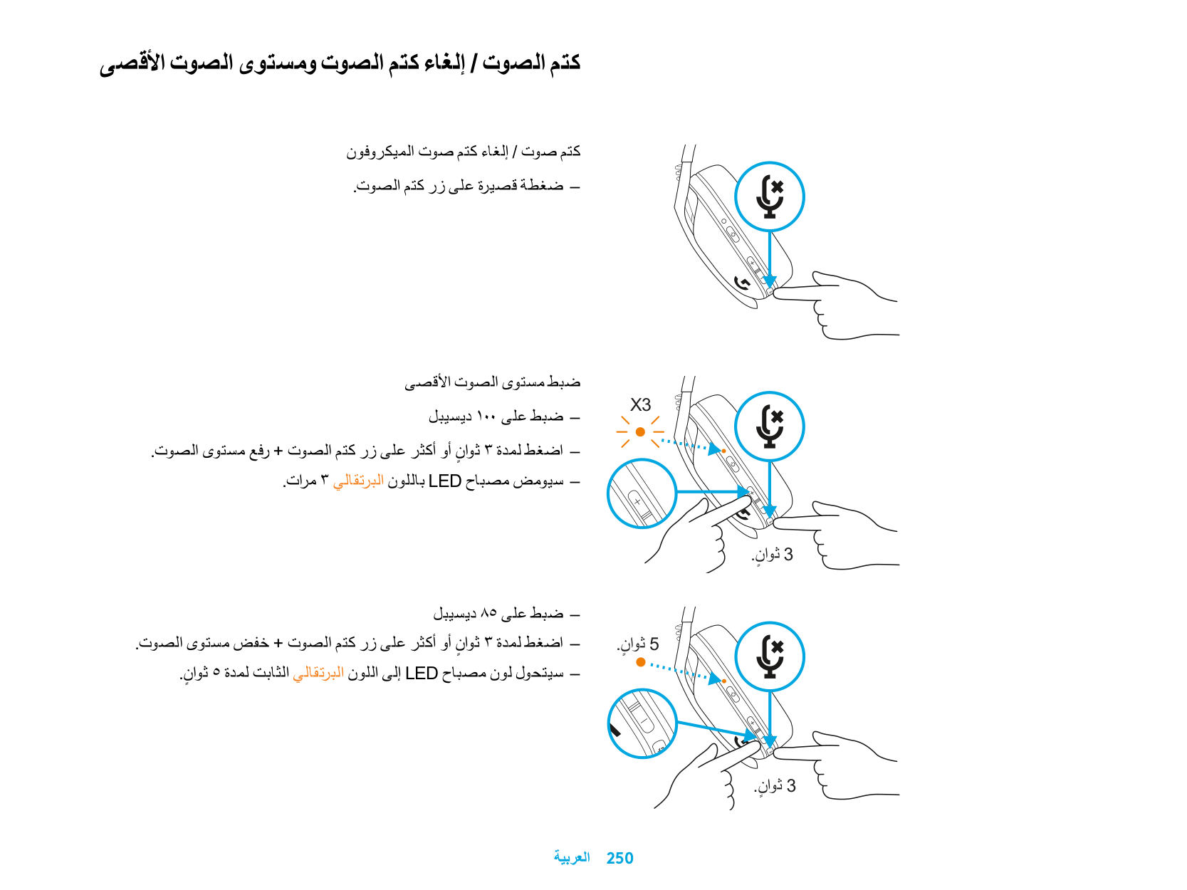 العربية 250 كتم صوت / إلغاء كتم صوت الميكروفون – .ضغطة قصيرة على زر كتم الصوت ضبط مستوى الصوت األقصى – ديسيبل100 ضبط على – . رفع مستوى الصوت+ ثوانٍ أو أكثر على زر كتم الصوت3 اضغط لمدة –