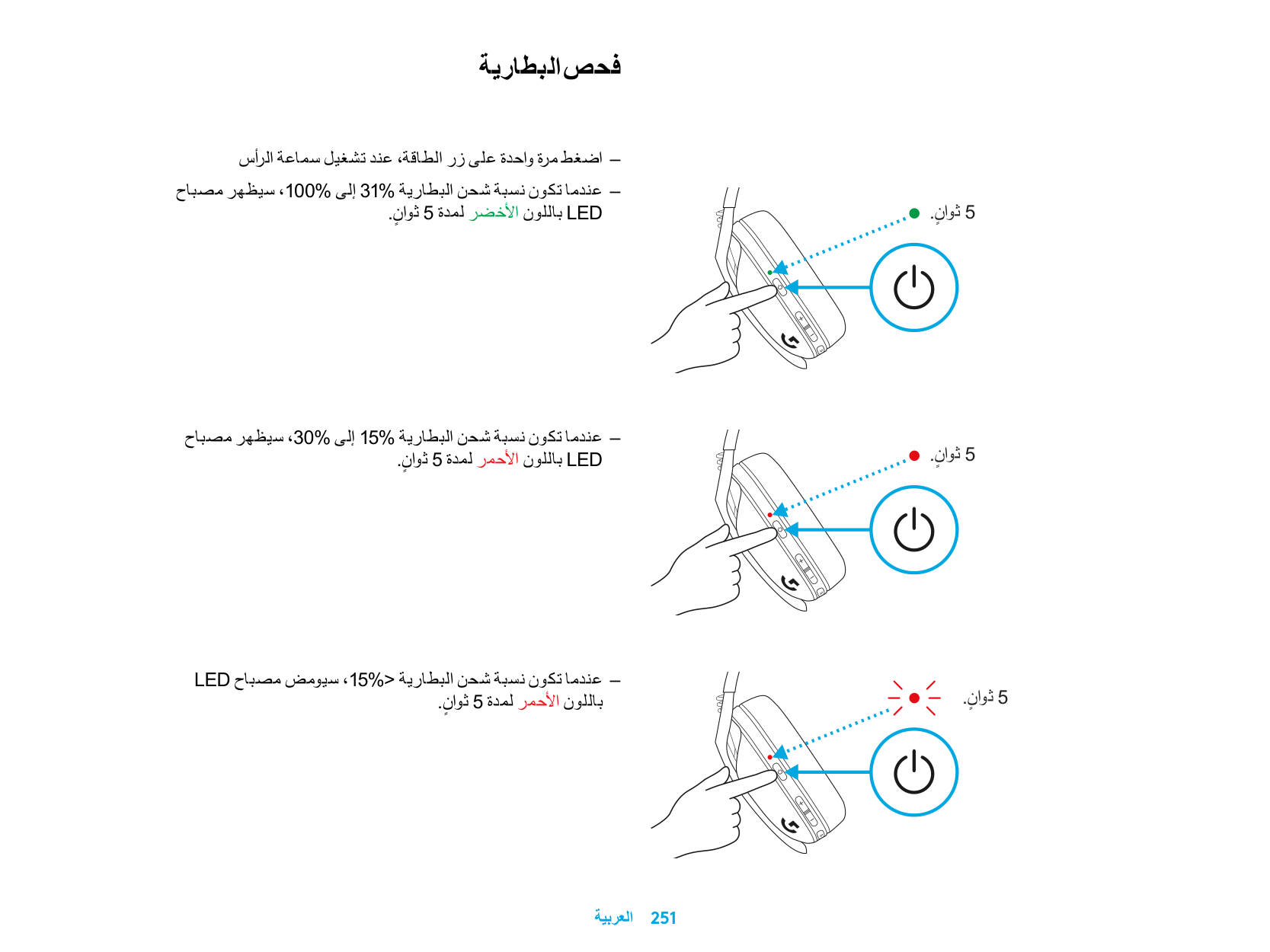.ٍ ثوان5 .ٍ ثوان3 .ٍ ثوان3 كتم الصوت / إلغاء كتم الصوت ومستوى الصوت األقصىالعربية 251 – اضغط مرة واحدة على زر الطاقة، عند تشغيل سماعة الرأس – ، سيظهر مصباح100% إلى31% عندما تكون نسبة شحن البطارية