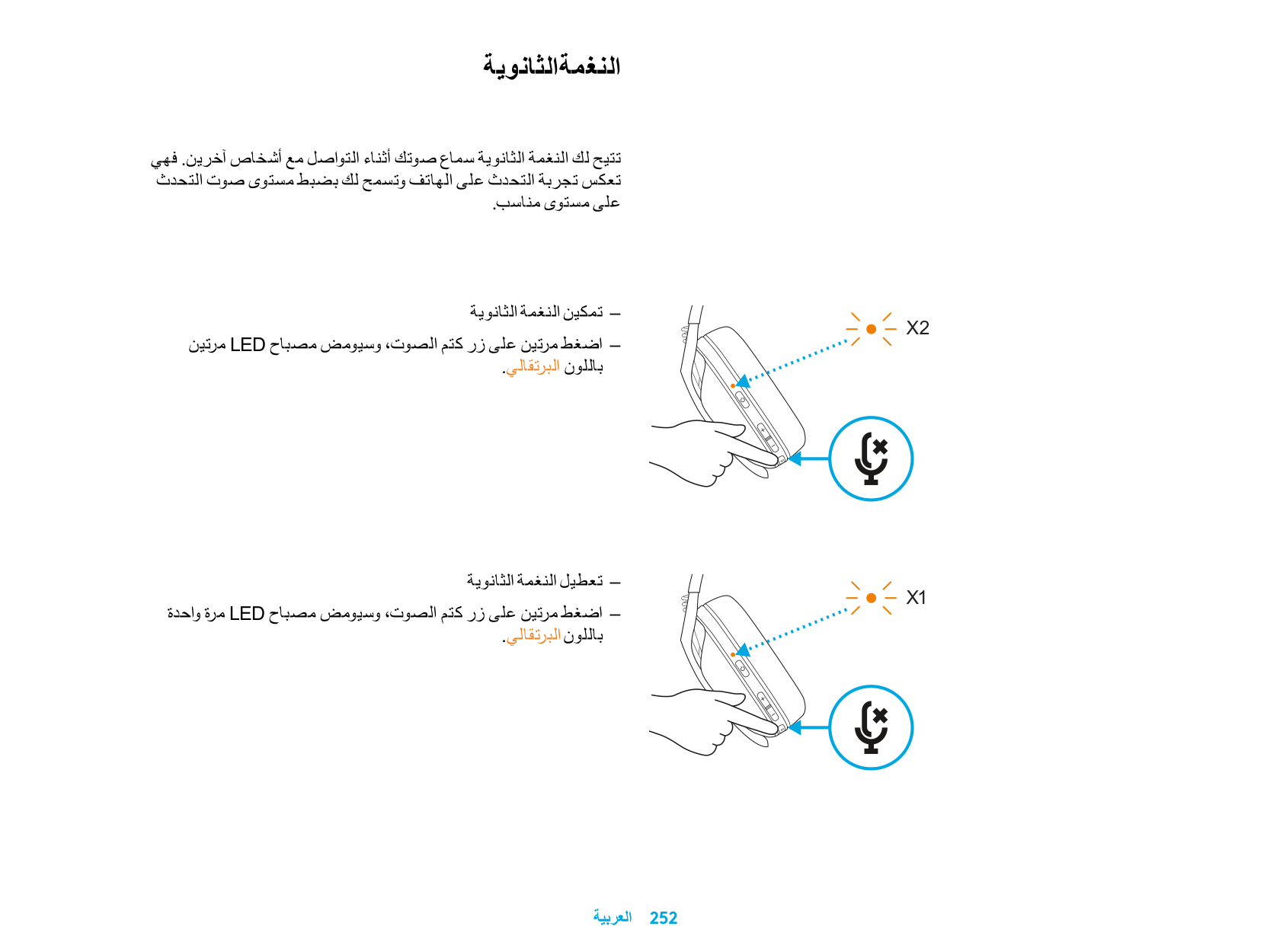 .البرتقالي باللون تتيح لك النغمة الثانوية سماع صوتك أثناء التواصل مع أشخاص آخرين. فهي تعكس تجربة التحدث على الهاتف وتسمح لك بضبط مستوى صوت التحدث .على مستوى مناسب النغمة الثانوية – تعطيل النغمة الثانوية –مرة واحدةLed اضغط مرتين على زر كتم الصوت، وسيومض مصباح