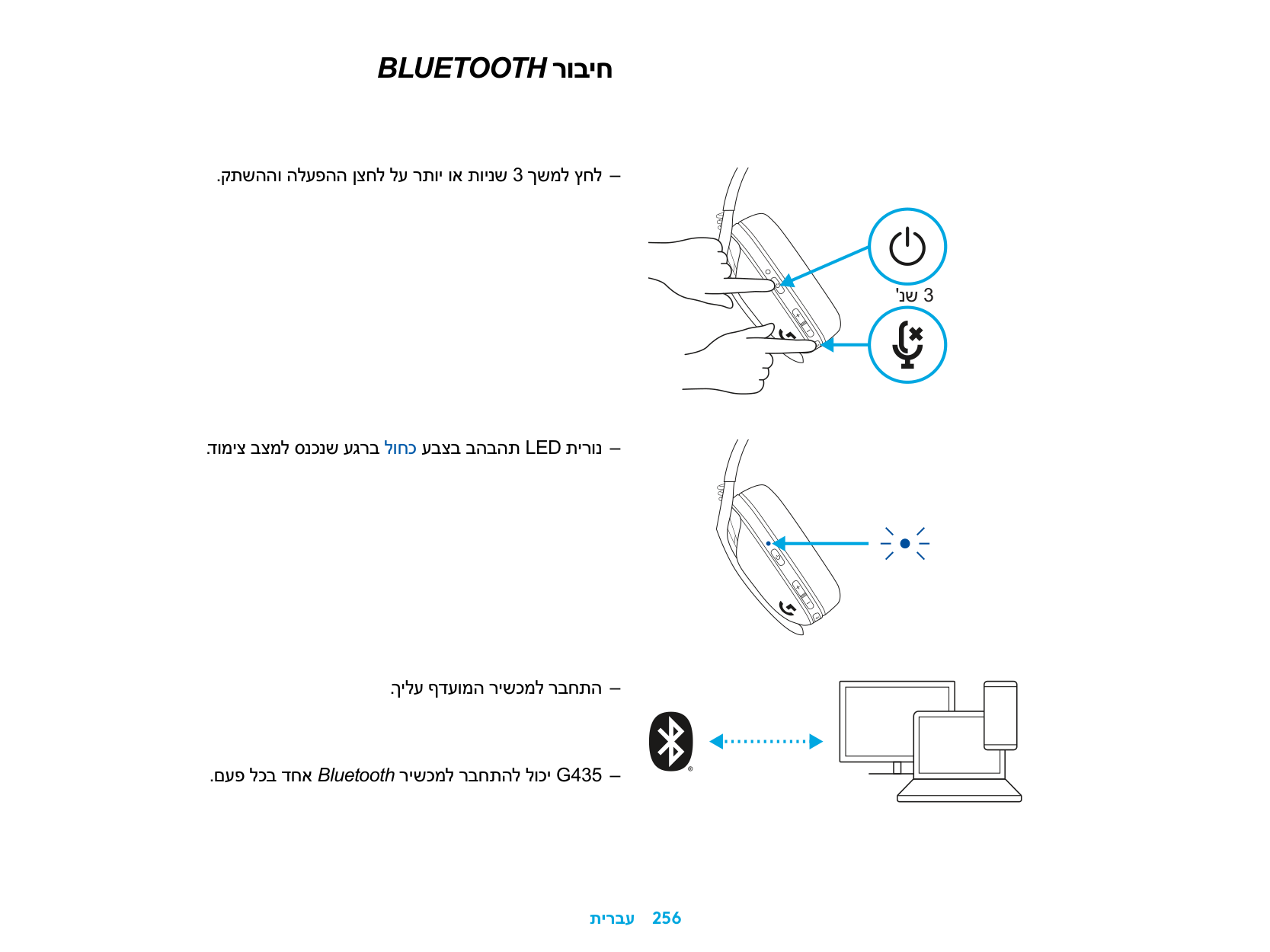 ' שנ3 – .התחבר למכשיר המועדף עליך – . אחד בכל פעםBluetooth יכול להתחבר למכשירG435עברית 257 ' שנ5 ' שנ5 – . שניות או יותר על לחצן השתק3 לחץ למשך – תאיר בצבעLED-, נורית הLiGHTSPEED החלף אל . שניות5 כחול ירוק למשך – כחול תאיר בצבעLED-, נורית הBluetooth החלף אל . שניות5 למשך ' שנ3