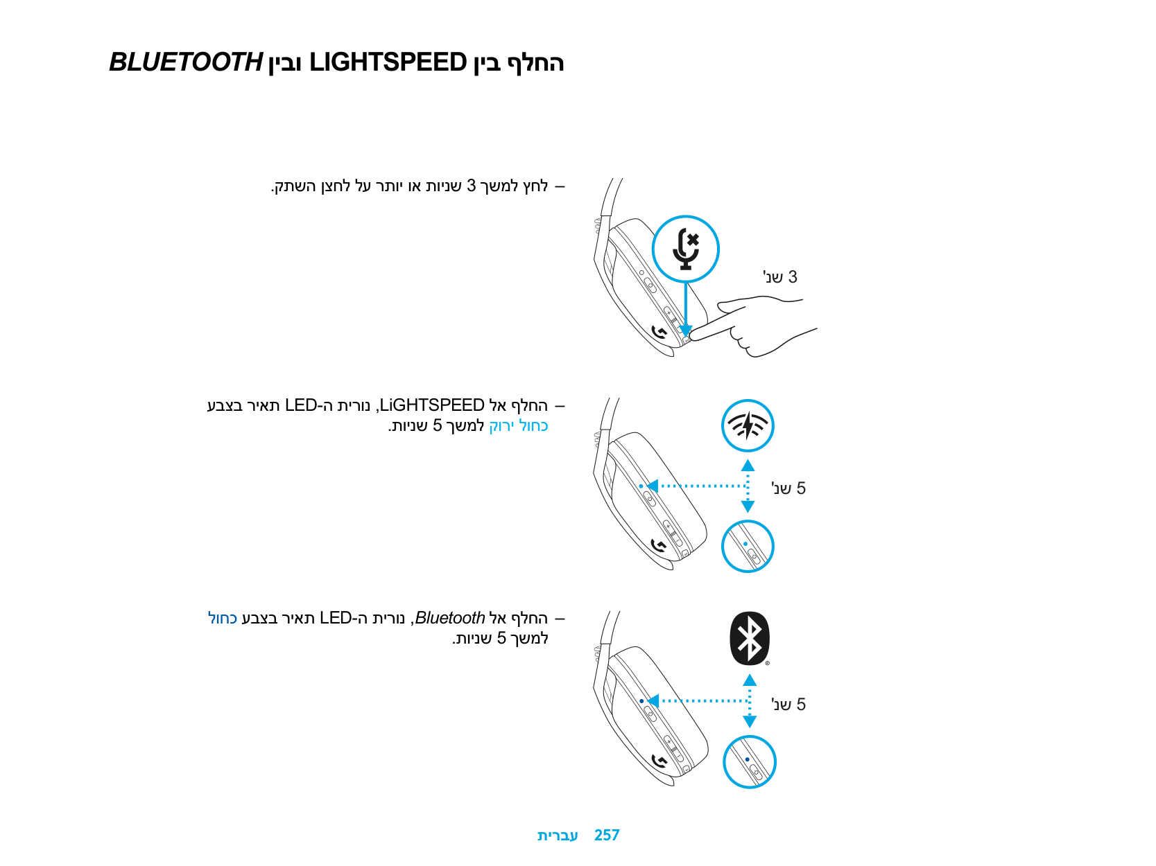 Press and hold the Mute button for 3 seconds or longer. When switching to LIGHTSPEED, the LED will light cyan for 5 seconds. When switching to Bluetooth, the LED will light blue for 5 seconds. (Page 5)