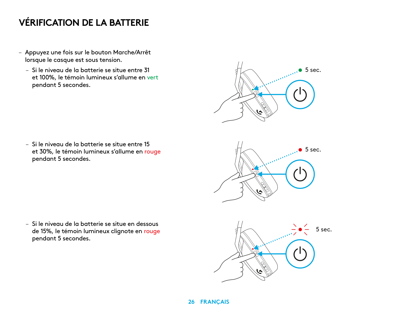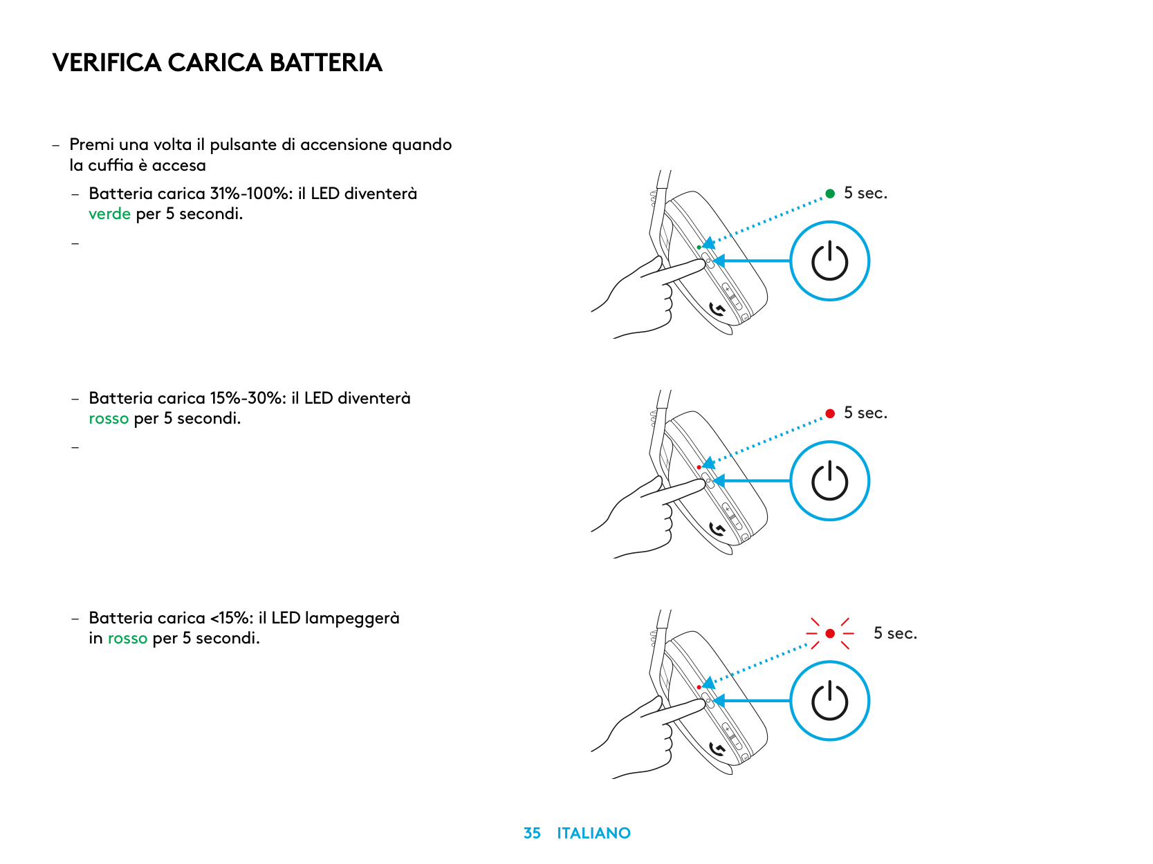 – Single press Power button, when headset is ON – Battery 31% to 100% the LED will show green for 5 seconds.Battery Check