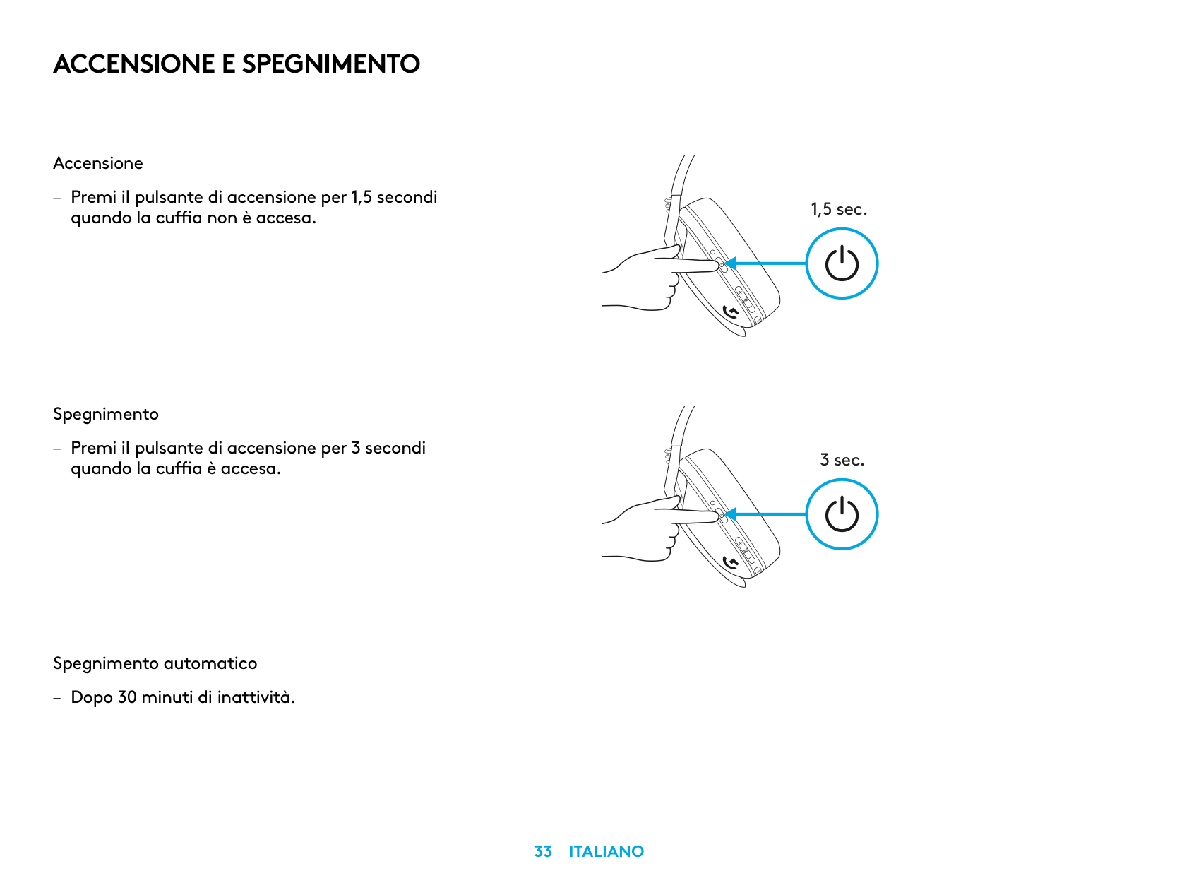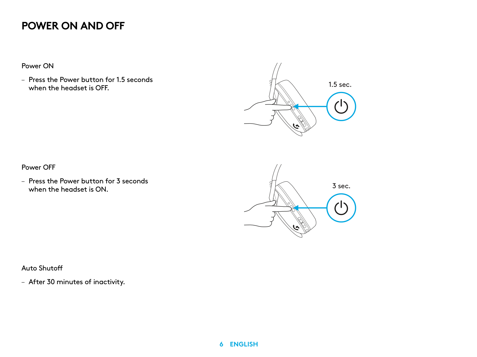 To power on, press the Power button for 1.5 seconds when the headset is off. To power off, press the Power button for 3 seconds when the headset is on. The headset will also automatically shut off after 30 minutes of inactivity. (Page 6)