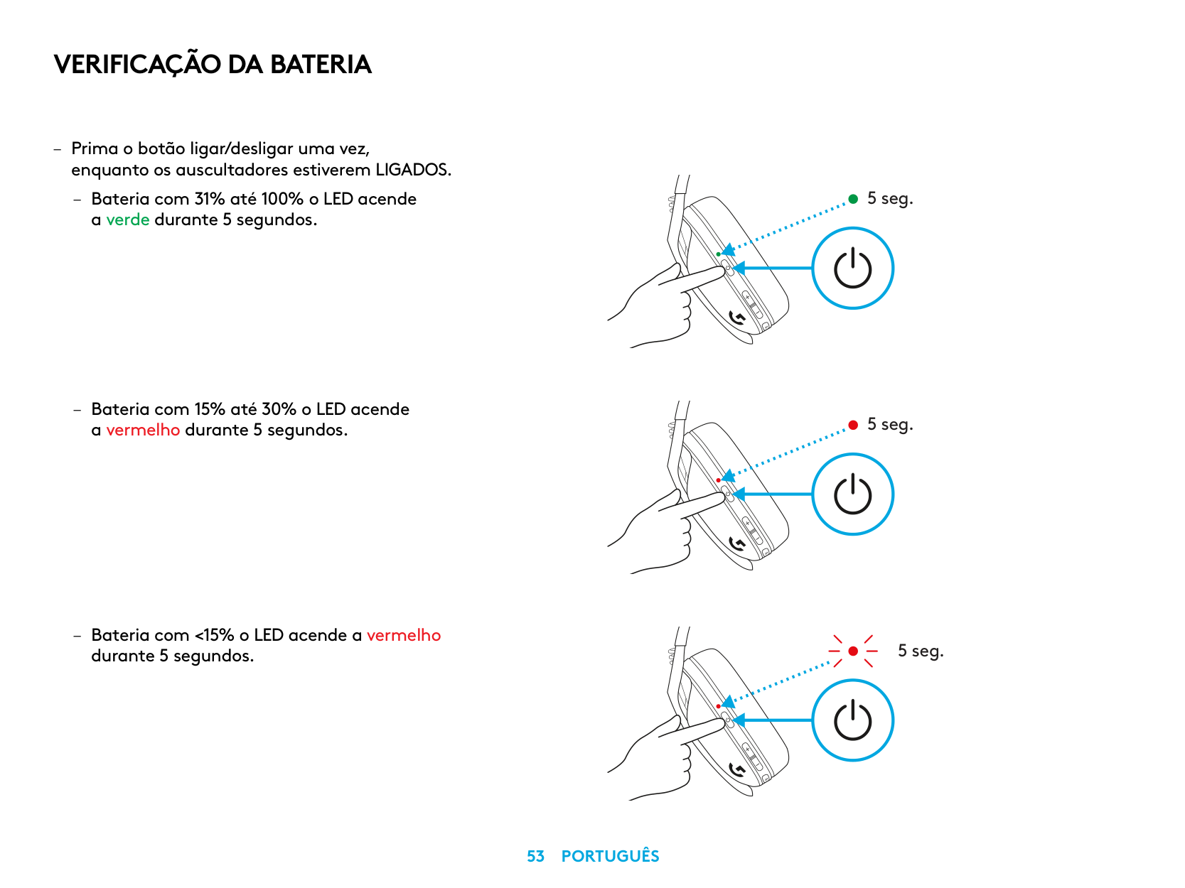 – Apăsaţi o singură dată pe butonul de alimentare când căştile sunt pornite. – Bateria la 31% – 100%: LED-ul se va aprinde în verde timp de 5 secunde.Verificarea Bateriei