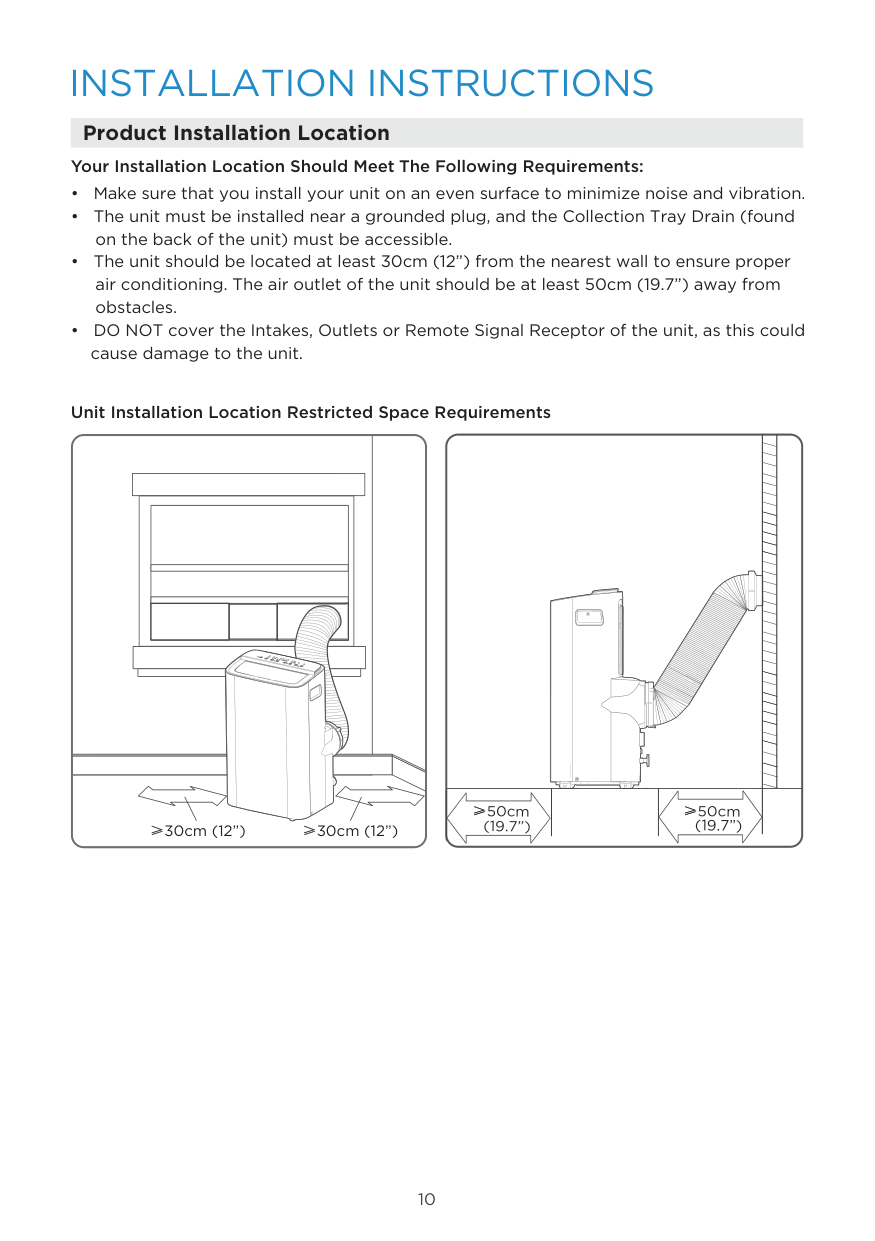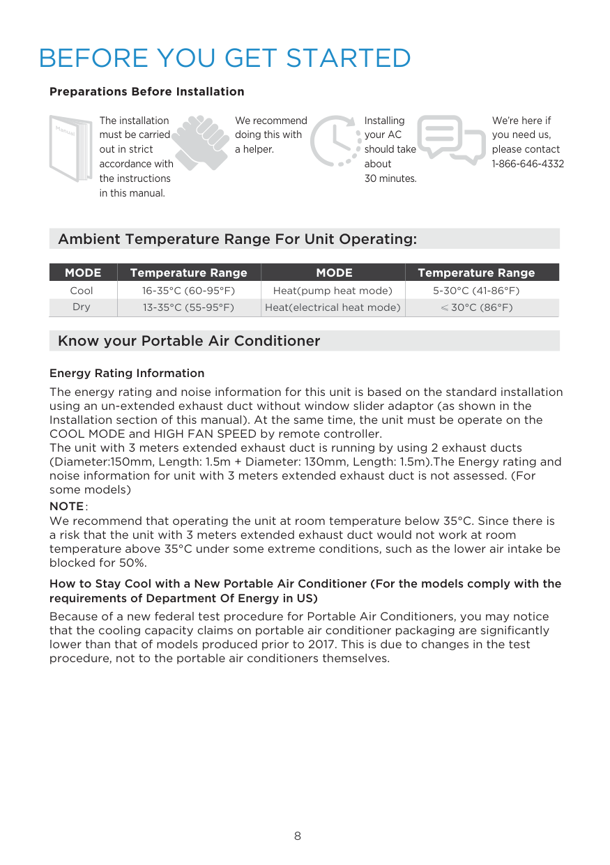 We recommend that operating the unit at room temperature below 35°C. Since there is a risk that the unit with 3 meters extended exhaust duct would not work at room temperature above 35°C under some extreme conditions, such as the lower air intake be blocked for 50%. The energy rating and noise information for this unit is based on the standard installation using an un-extended exhaust duct without window slider adaptor (as shown in the Installation section of this manual). At the same time, the unit must be operate on the COOL MODE and HIGH FAN SPEED by remote controller. The unit with 3 meters extended exhaust duct is running by using 2 exhaust ducts (Diameter:150mm, Length: 1.5m + Diameter: 130mm, Length: 1.5m).The Energy rating and noise information for unit with 3 meters extended exhaust duct is not assessed. (For some models) The installation must be carried out in strict accordance with the instructions in this manual. We recommend doing this with a helper. Installing your AC should take about 30 minutes. We’re here if you need us, please contact 1-866-646-4332 Preparations Before Installation Manual Ambient Temperature Range For Unit Operating: Know your Portable Air Conditioner How to Stay Cool with a New Portable Air Conditioner (For the models comply with the requirements of Department Of Energy in US) Because of a new federal test procedure for Portable Air Conditioners, you may notice that the cooling capacity claims on portable air conditioner packaging are significantly lower than that of models produced prior to 2017. This is due to changes in the test procedure, not to the portable air conditioners themselves.Mode