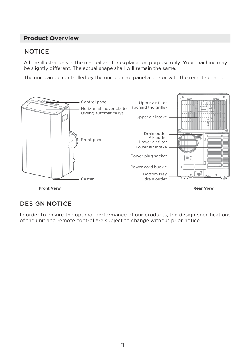 All the illustrations in the manual are for explanation purpose only. Your machine may be slightly different. The actual shape shall will remain the same. The unit can be controlled by the unit control panel alone or with the remote control. Front View Rear View Drain outlet Caster Horizontal louver blade (swing automatically) Control panel Front panel Power plug socket Power cord buckle Bottom tray drain outlet Upper air filter (behind the grille) Upper air intake Lower air filter Lower air intake Air outlet12 Installation Overview