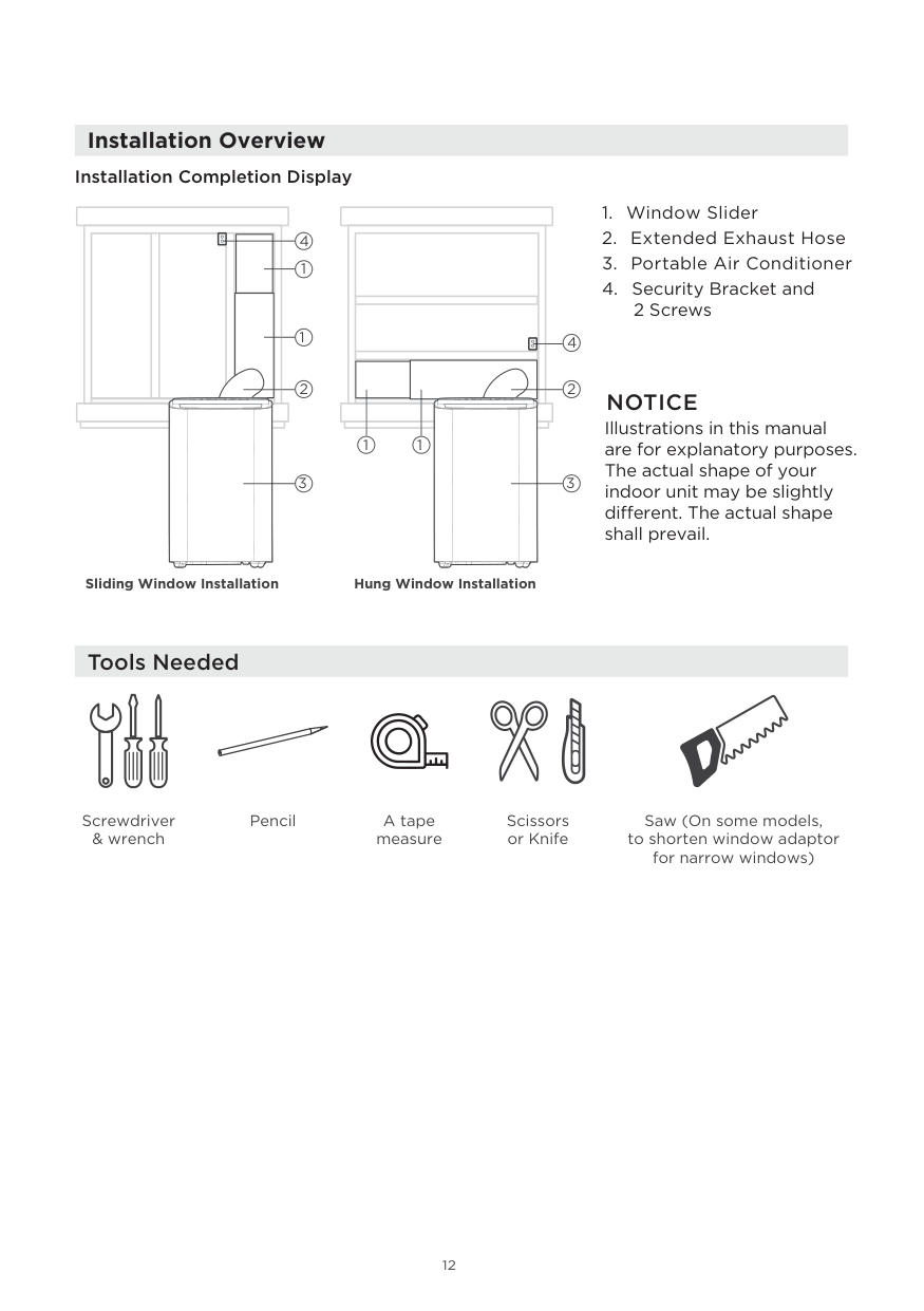 Illustrations in this manual are for explanatory purposes. The actual shape of your indoor unit may be slightly different. The actual shape shall prevail. Sliding Window Installation Hung Window Installation1 4 1 2 2 1 1 4 3 3