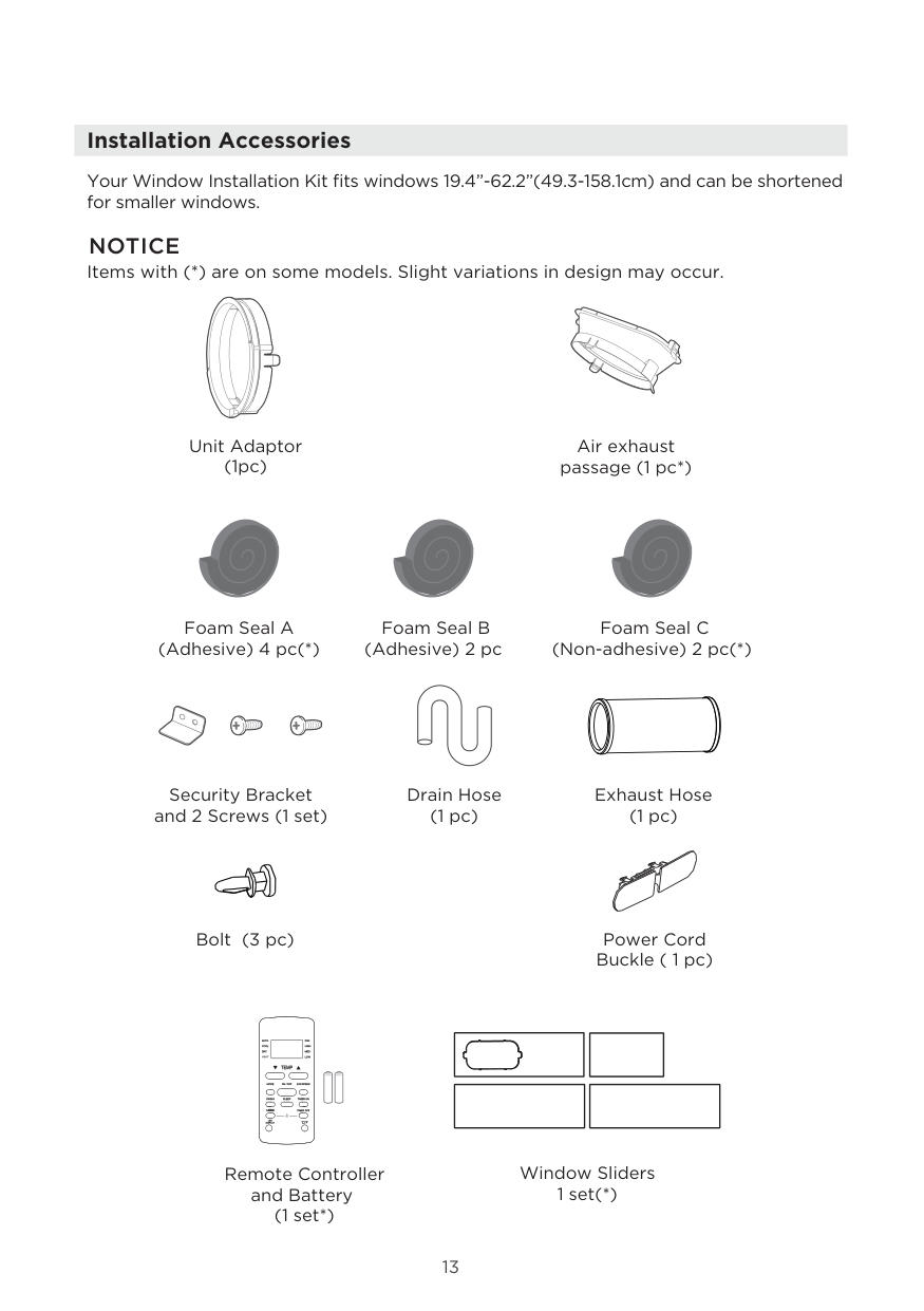 Items with (*) are on some models. Slight variations in design may occur. Your Window Installation Kit fits windows 19.4”-62.2”(49.3-158.1cm) and can be shortened for smaller windows. Remote Controller and Battery (1 set*) Bolt (3 pc) Security Bracket and 2 Screws (1 set) (1 pc) Exhaust Hose Drain Hose (1 pc) Foam Seal A (Adhesive) 4 pc(*) Foam Seal B (Adhesive) 2 pc Foam Seal C (Non-adhesive) 2 pc(*) Power Cord Buckle ( 1 pc) Air exhaust passage (1 pc*) (1pc) Unit Adaptor Window Sliders 1 set(*)C-Sense