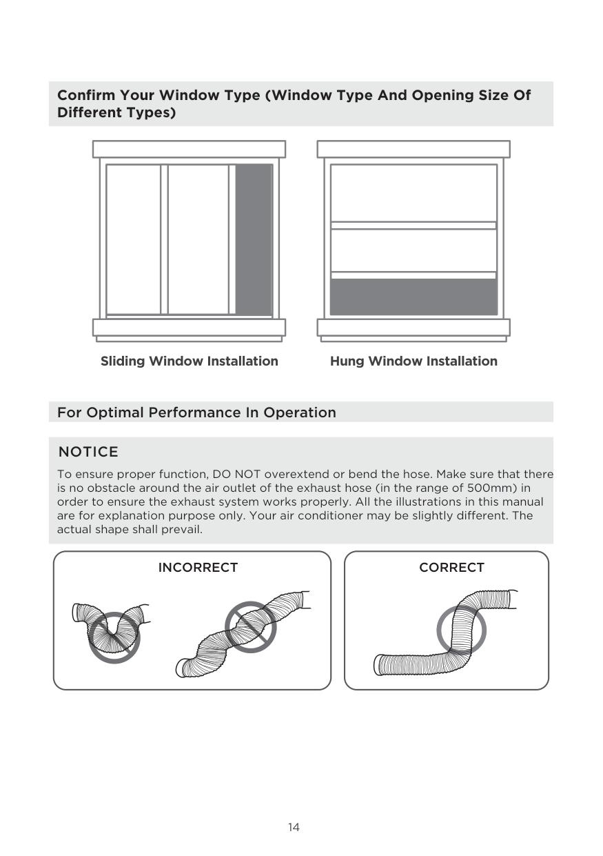 To ensure proper function, DO NOT overextend or bend the hose. Make sure that there is no obstacle around the air outlet of the exhaust hose (in the range of 500mm) in order to ensure the exhaust system works properly. All the illustrations in this manual are for explanation purpose only. Your air conditioner may be slightly different. The actual shape shall prevail.Correct