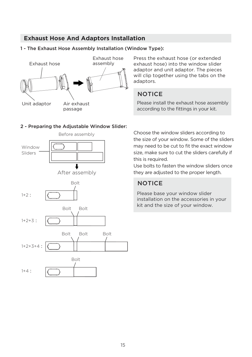 Please install the exhaust hose assembly according to the fittings in your kit. Choose the window sliders according to the size of your window. Some of the sliders may need to be cut to fit the exact window size, make sure to cut the sliders carefully if this is required. Use bolts to fasten the window sliders once they are adjusted to the proper length.Notice