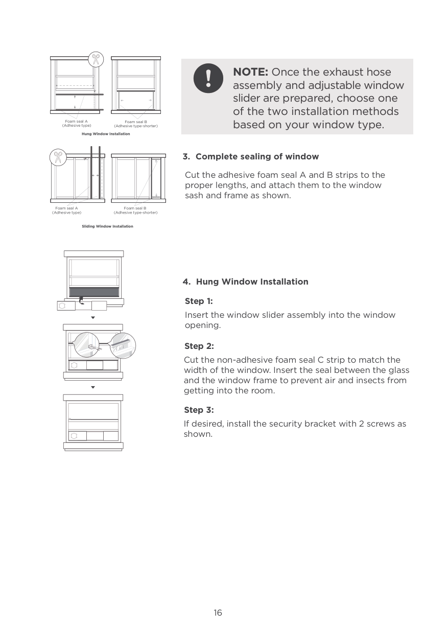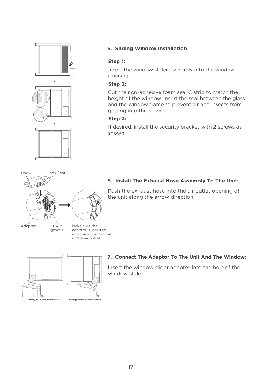 Step 3: Foam seal B (Adhesive type-shorter) Foam seal A (Adhesive type) Foam seal B (Adhesive type-shorter) Foam seal A (Adhesive type) Hung Window Installation Sliding Window Installation Cut the adhesive foam seal A and B strips to the proper lengths, and attach them to the window sash and frame as shown. 1617 Hook Hook Seat Lower groove Adapter Make sure the adaptor is inserted into the lower groove of the air outlet. Hung Window Installation Sliding Window Installation