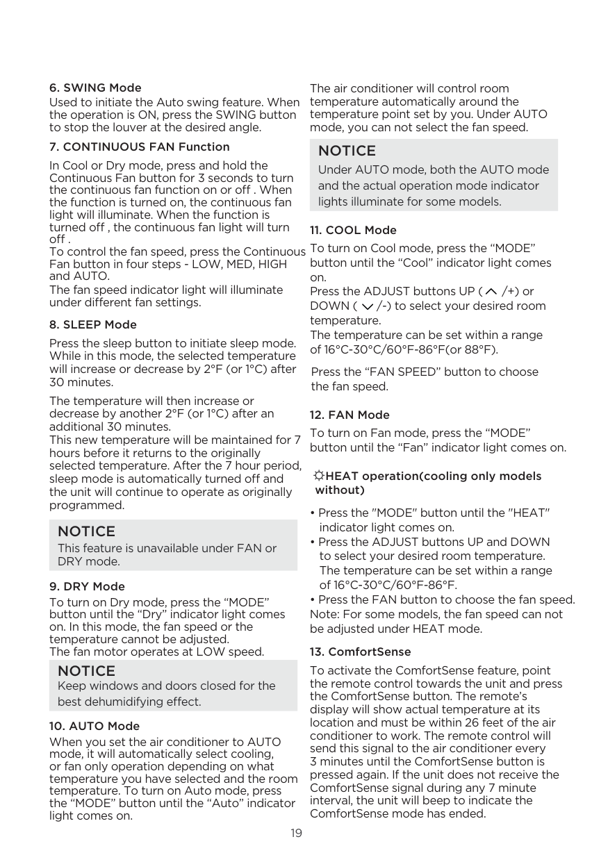 The SLEEP function is used to decrease energy use while you sleep (and don’t need the same temperature settings to stay comfortable). This function can only be activated via remote control. The sleep function is not available in Fan or Dry mode. Please refer to the OWNER’S MANUAL for more details. When the C-SENSE function is activated, the remote display is actual temperature at its location. The remote control will send this signal to the air conditioner every 3 minutes interval until press the C-SENSE button again.Of