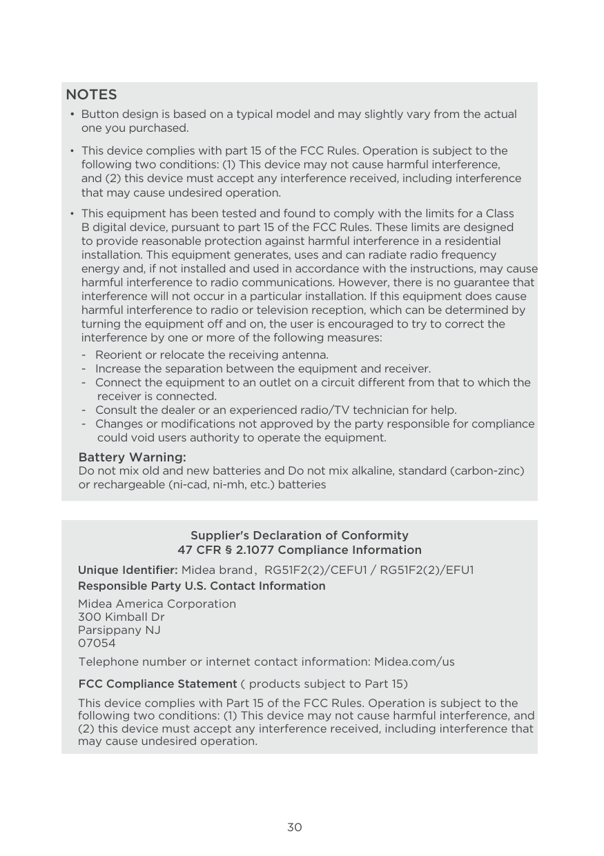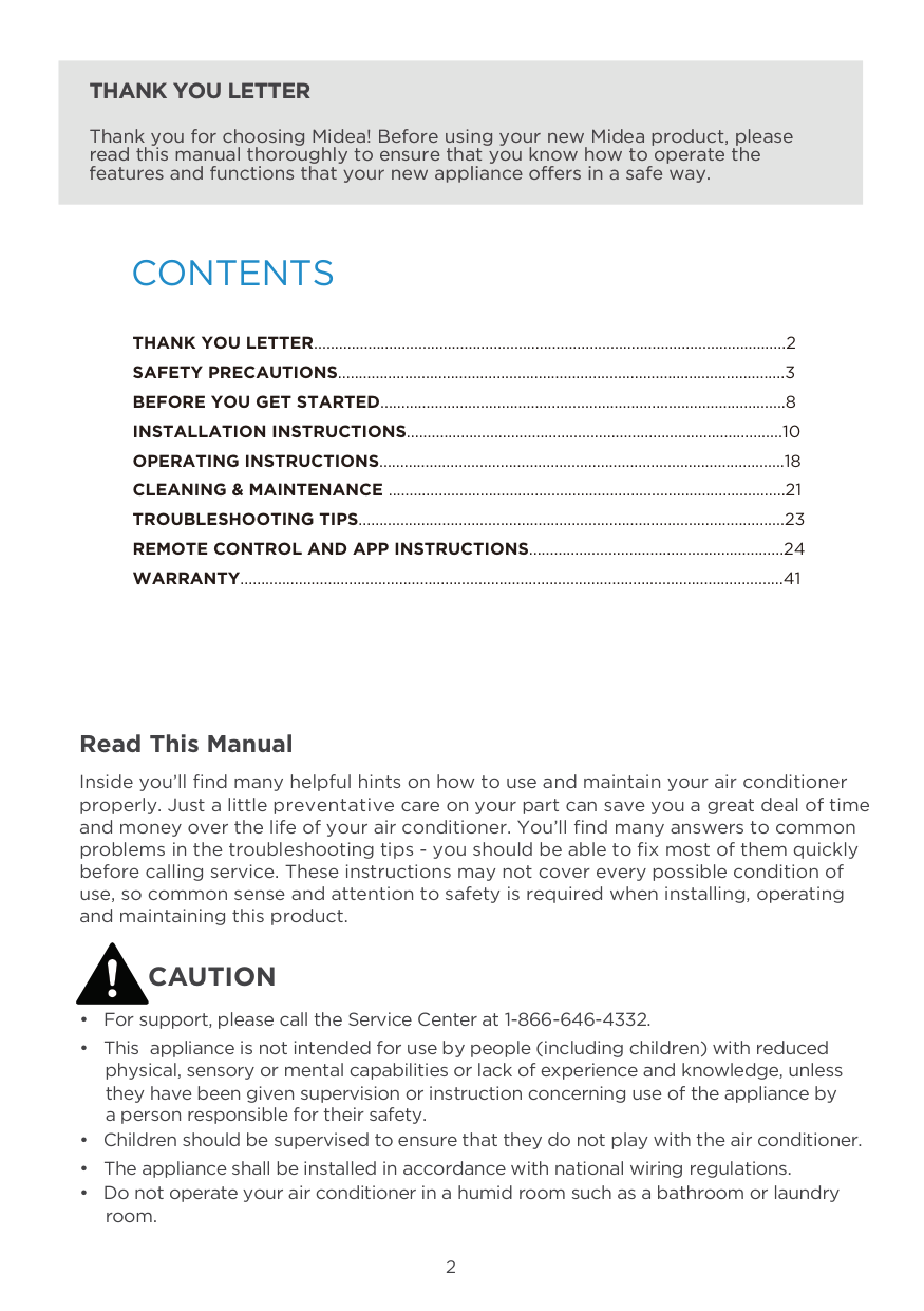 Thank you for choosing Midea! Before using your new Midea product, please read this manual thoroughly to ensure that you know how to operate the THANK YOU LETTER.................................................................................................................2 SAFETY PRECAUTIONS...........................................................................................................3 BEFORE YOU GET STARTED.................................................................................................8 INSTALLATION INSTRUCTIONS..........................................................................................10 OPERATING INSTRUCTIONS.................................................................................................18 CLEANING & MAINTENANCE ...............................................................................................21 TROUBLESHOOTING TIPS......................................................................................................23 REMOTE CONTROL AND APP INSTRUCTIONS.............................................................24 WARRANTY..................................................................................................................................413