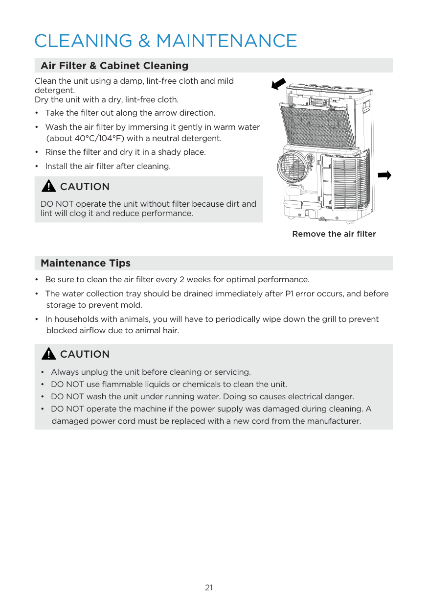 Air Filter & Cabinet Cleaning Maintenance Tips Clean the unit using a damp, lint-free cloth and mild detergent. Dry the unit with a dry, lint-free cloth.Caution