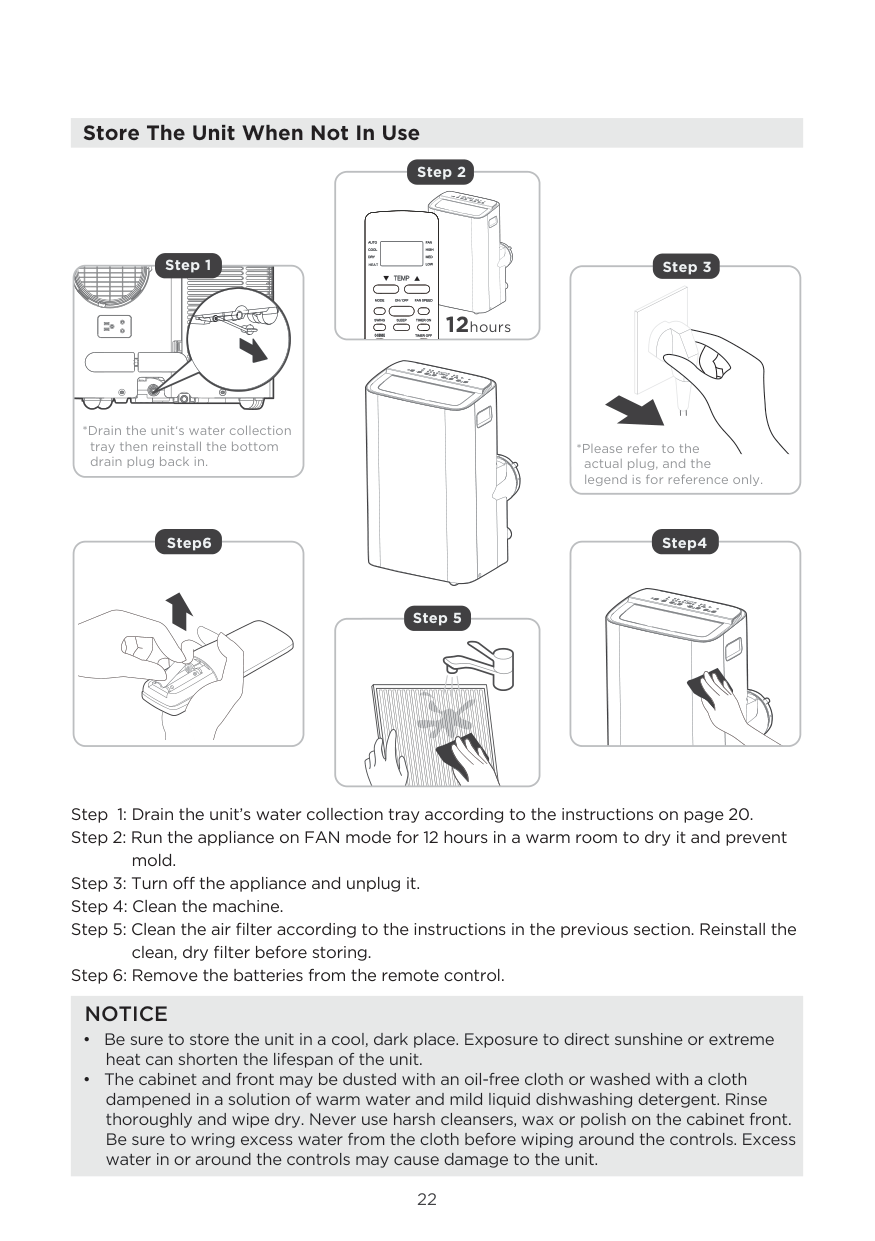22 Store The Unit When Not In Use Step 1: Drain the unit’s water collection tray according to the instructions on page 20. Step 2: Run the appliance on FAN mode for 12 hours in a warm room to dry it and prevent mold. Step 3: Turn off the appliance and unplug it. Step 4: Clean the machine. Step 5: Clean the air filter according to the instructions in the previous section. Reinstall the clean, dry filter before storing. Step 6: Remove the batteries from the remote control.