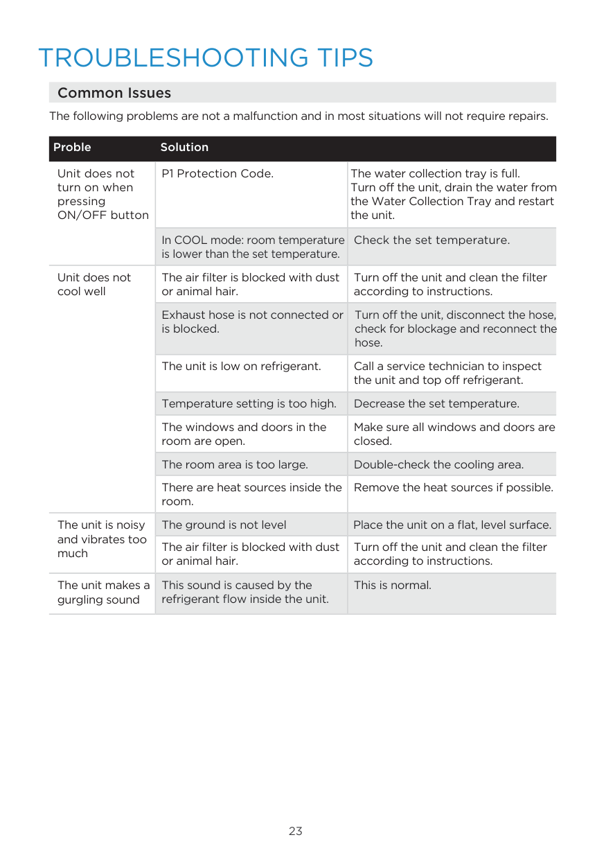 23 Decrease the set temperature. Call a service technician to inspect the unit and top off refrigerant. The water collection tray is full. Turn off the unit, drain the water from the Water Collection Tray and restart the unit. Common Issues The following problems are not a malfunction and in most situations will not require repairs. Proble Solution Unit does not turn on when pressing ON/OFF button P1 Protection Code. In COOL mode: room temperature is lower than the set temperature. Check the set temperature. Unit does not cool well The air filter is blocked with dust or animal hair. Turn off the unit and clean the filter according to instructions. Exhaust hose is not connected or is blocked. Turn off the unit, disconnect the hose, check for blockage and reconnect the hose. The unit is low on refrigerant. Temperature setting is too high. The windows and doors in the room are open. Make sure all windows and doors are closed. The room area is too large. There are heat sources inside the room. Remove the heat sources if possible. The unit is noisy and vibrates too much The ground is not level Place the unit on a flat, level surface. The air filter is blocked with dust or animal hair. Turn off the unit and clean the filter according to instructions. The unit makes a gurgling sound This sound is caused by the refrigerant flow inside the unit. This is normal. Double-check the cooling area.
