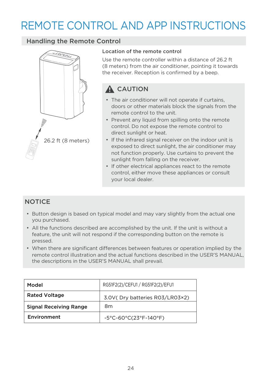 Location of the remote control Use the remote controller within a distance of 26.2 ft (8 meters) from the air conditioner, pointing it towards the receiver. Reception is confirmed by a beep. Handling the Remote ControlCaution