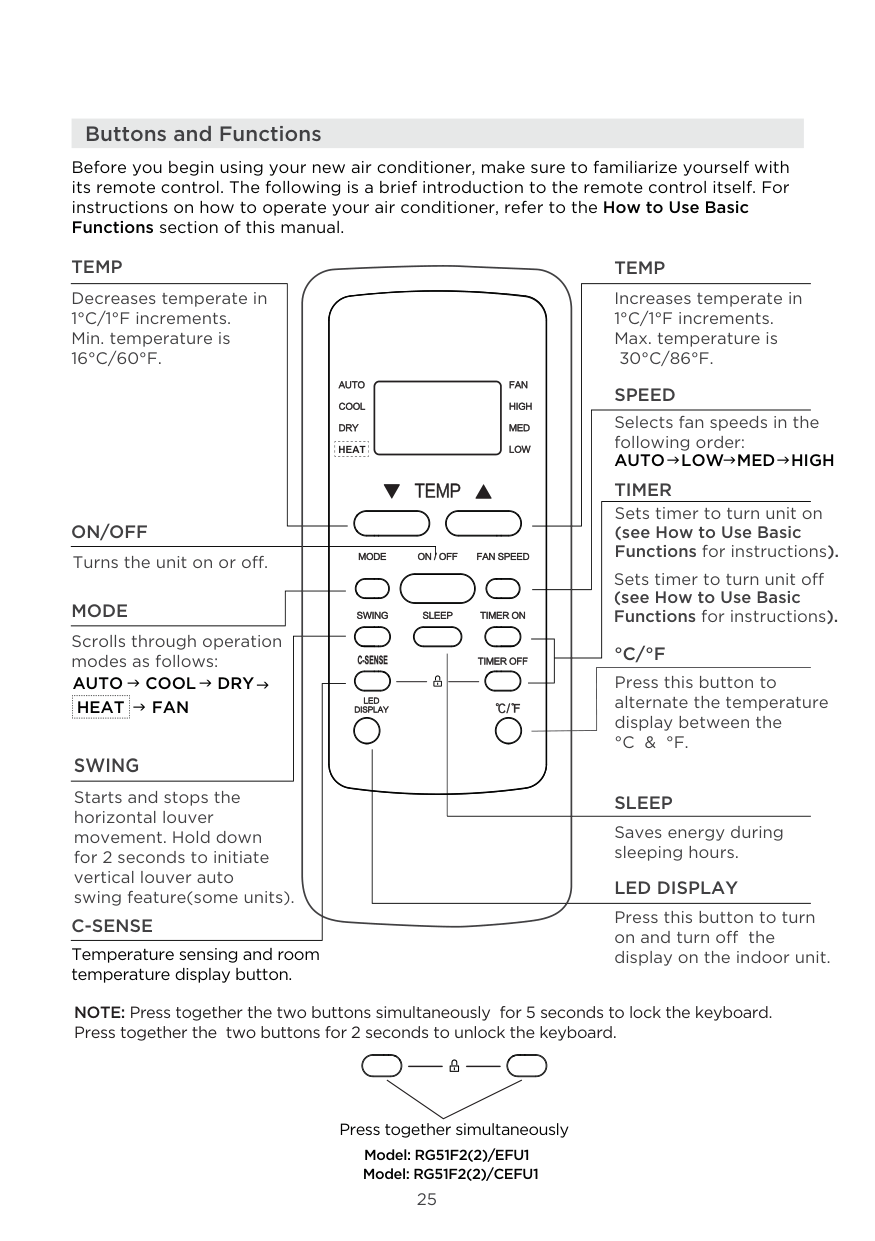 NOTE: Press together the two buttons simultaneously for 5 seconds to lock the keyboard. Press together the two buttons for 2 seconds to unlock the keyboard. Press together simultaneously Before you begin using your new air conditioner, make sure to familiarize yourself with its remote control. The following is a brief introduction to the remote control itself. For instructions on how to operate your air conditioner, refer to the How to Use Basic Functions section of this manual. Buttons and Functions Model: RG51F2(2)/EFU1C-Sense