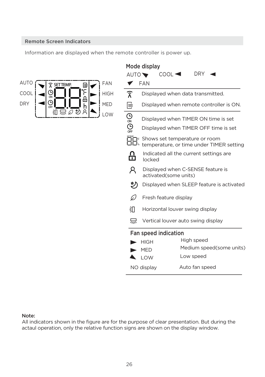 Mode display Fan speed indication Displayed when C-SENSE feature is activated(some units) Displayed when SLEEP feature is activatedAuto