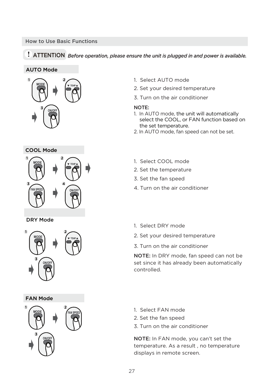 Horizontal louver swing display Vertical louver auto swing display Fresh feature display Remote Screen Indicators27 AUTO Mode COOL Mode DRY Mode