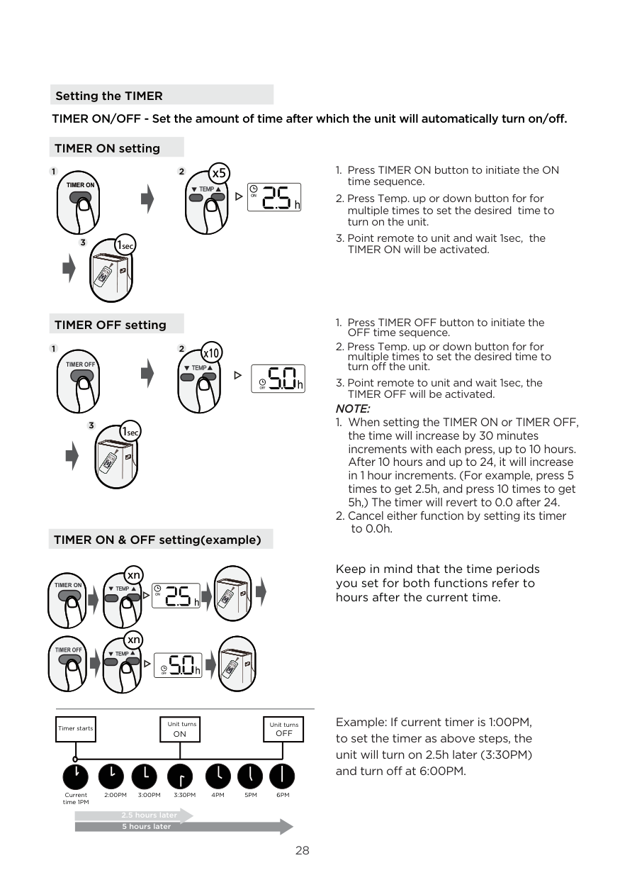 Example: If current timer is 1:00PM, to set the timer as above steps, the unit will turn on 2.5h later (3:30PM) and turn off at 6:00PM.Keep in mind that the time periods you set for both functions refer to hours after the current time. x5