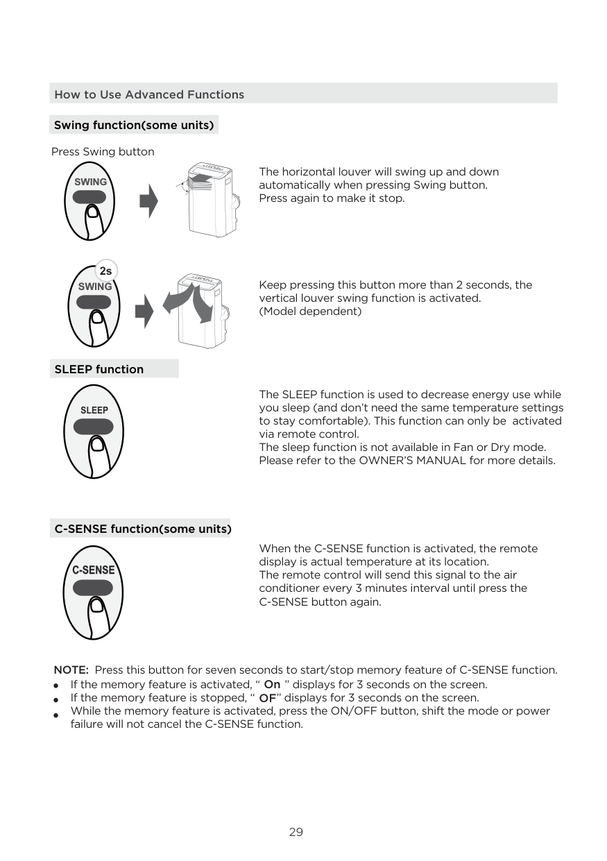 How to Use Advanced Functions Swing function(some units) C-SENSE function(some units) SLEEP function Press Swing button The horizontal louver will swing up and down automatically when pressing Swing button. Press again to make it stop. Keep pressing this button more than 2 seconds, the vertical louver swing function is activated. (Model dependent)Swing
