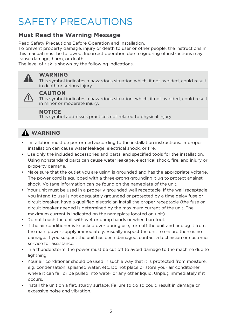 Must Read the Warning Message Read Safety Precautions Before Operation and Installation. To prevent property damage, injury or death to user or other people, the instructions in this manual must be followed. Incorrect operation due to ignoring of instructions may cause damage, harm, or death. The level of risk is shown by the following indications.Notice