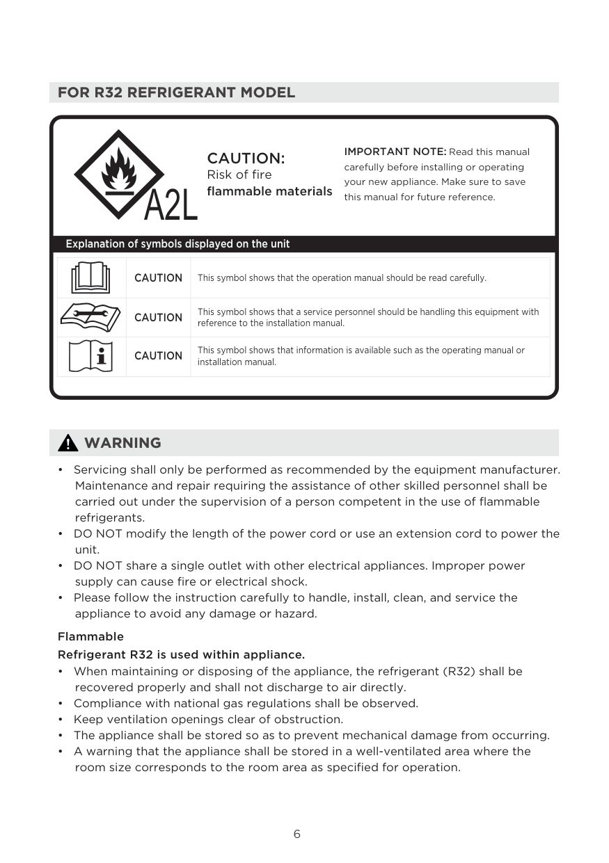 Risk of fire flammable materials IMPORTANT NOTE: Read this manual carefully before installing or operating your new appliance. Make sure to save this manual for future reference. Explanation of symbols displayed on the unitCaution