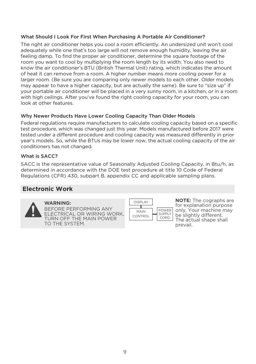 ≥9 What Should I Look For First When Purchasing A Portable Air Conditioner? The right air conditioner helps you cool a room efficiently. An undersized unit won’t cool adequately while one that’s too large will not remove enough humidity, leaving the air feeling damp. To find the proper air conditioner, determine the square footage of the room you want to cool by multiplying the room length by its width. You also need to know the air conditioner’s BTU (British Thermal Unit) rating, which indicates the amount of heat it can remove from a room. A higher number means more cooling power for a larger room. (Be sure you are comparing only newer models to each other. Older models may appear to have a higher capacity, but are actually the same). Be sure to “size up” if your portable air conditioner will be placed in a very sunny room, in a kitchen, or in a room with high ceilings. After you’ve found the right cooling capacity for your room, you can look at other features. Why Newer Products Have Lower Cooling Capacity Than Older Models Federal regulations require manufacturers to calculate cooling capacity based on a specific test procedure, which was changed just this year. Models manufactured before 2017 were tested under a different procedure and cooling capacity was measured differently in prior year’s models. So, while the BTUs may be lower now, the actual cooling capacity of the air conditioners has not changed. What is SACC? SACC is the representative value of Seasonally Adjusted Cooling Capacity, in Btu/h, as determined in accordance with the DOE test procedure at title 10 Code of Federal Regulations (CFR) 430, subpart B, appendix CC and applicable sampling plans. Electronic Work