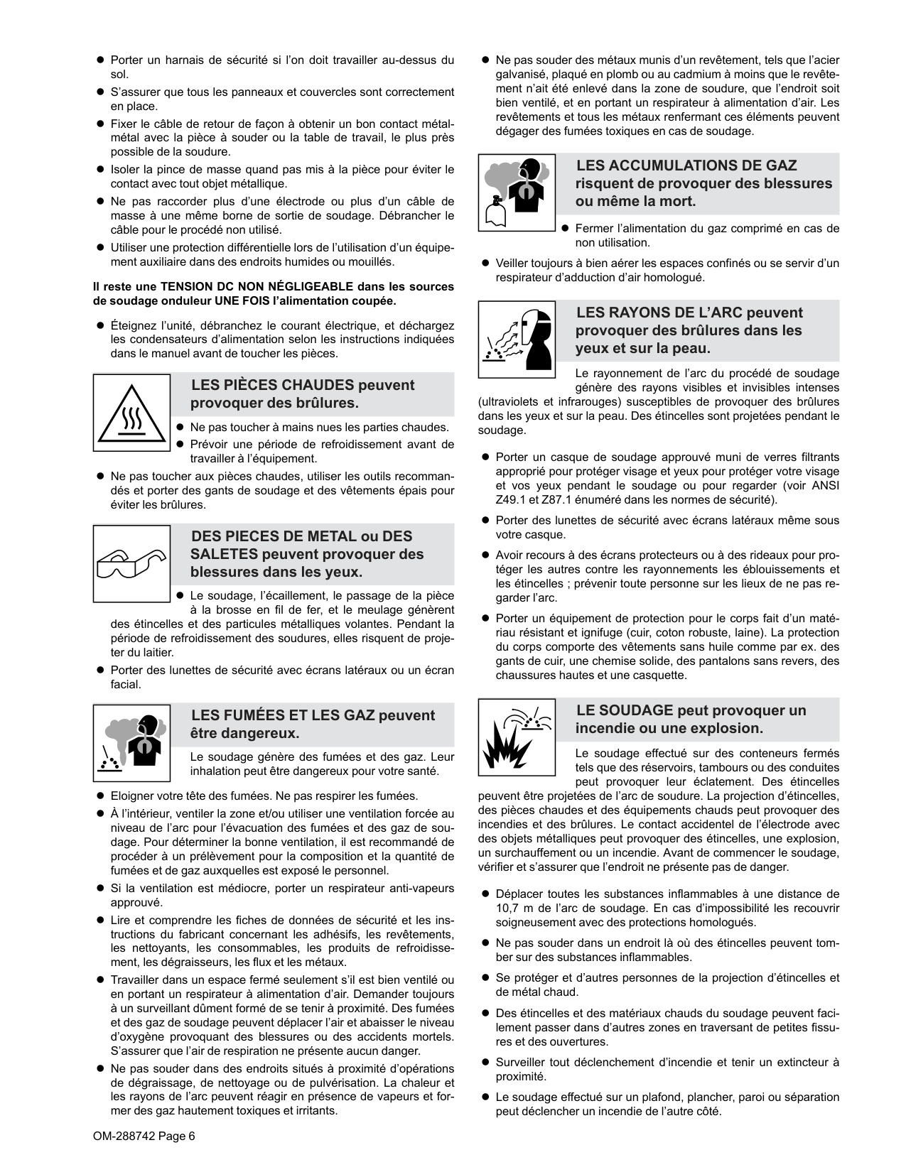 risquent de provoquer des blessures ou même la mort. l Fermer l’alimentation du gaz comprimé en cas de non utilisation. l Veiller toujours à bien aérer les espaces confinés ou se servir d’un respirateur d’adduction d’air homologué. LES RAYONS DE L’ARC peuvent provoquer des brûlures dans les yeux et sur la peau. Le rayonnement de l’arc du procédé de soudage génère des rayons visibles et invisibles intenses (ultraviolets et infrarouges) susceptibles de provoquer des brûlures dans les yeux et sur la peau. Des étincelles sont projetées pendant le soudage. l Porter un casque de soudage approuvé muni de verres filtrants approprié pour protéger visage et yeux pour protéger votre visage et vos yeux pendant le soudage ou pour regarder (voir ANSI Z49.1 et Z87.1 énuméré dans les normes de sécurité). l Porter des lunettes de sécurité avec écrans latéraux même sous votre casque. l Avoir recours à des écrans protecteurs ou à des rideaux pour pro- téger les autres contre les rayonnements les éblouissements et les étincelles ; prévenir toute personne sur les lieux de ne pas re- garder l’arc. l Porter un équipement de protection pour le corps fait d’un maté- riau résistant et ignifuge (cuir, coton robuste, laine). La protection du corps comporte des vêtements sans huile comme par ex. des gants de cuir, une chemise solide, des pantalons sans revers, des chaussures hautes et une casquette. LE SOUDAGE peut provoquer un incendie ou une explosion. Le soudage effectué sur des conteneurs fermés tels que des réservoirs, tambours ou des conduites peut provoquer leur éclatement. Des étincelles peuvent être projetées de l’arc de soudure. La projection d’étincelles, des pièces chaudes et des équipements chauds peut provoquer des incendies et des brûlures. Le contact accidentel de l’électrode avec des objets métalliques peut provoquer des étincelles, une explosion, un surchauffement ou un incendie. Avant de commencer le soudage, vérifier et s’assurer que l’endroit ne présente pas de danger. l Déplacer toutes les substances inflammables à une distance de 10,7 m de l’arc de soudage. En cas d’impossibilité les recouvrir soigneusement avec des protections homologués. l Ne pas souder dans un endroit là où des étincelles peuvent tom- ber sur des substances inflammables. l Se protéger et d’autres personnes de la projection d’étincelles et de métal chaud. l Des étincelles et des matériaux chauds du soudage peuvent faci- lement passer dans d’autres zones en traversant de petites fissu- res et des ouvertures. l Surveiller tout déclenchement d’incendie et tenir un extincteur à proximité. l Le soudage effectué sur un plafond, plancher, paroi ou séparation peut déclencher un incendie de l’autre côté.OM-288742 Page 7 l Ne pas couper ou souder des jantes ou des roues. Les pneus peu- vent exploser s’ils sont chauffés. Les jantes et les roues réparées peuvent défaillir. Voir OSHA 29 CFR 1910.177 énuméré dans les normes de sécurité. l Ne pas effectuer le soudage sur des conteneurs fermés tels que des réservoirs, tambours, ou conduites, à moins qu’ils n’aient été préparés correctement conformément à AWS F4.1 et AWS A6.0 (voir les Normes de Sécurité). l Ne pas souder là où l’air ambiant pourrait contenir des poussières, gaz ou émanations inflammables (vapeur d’essence, par exemple). l Brancher le câble de masse sur la pièce le plus près possible de la zone de soudage pour éviter le transport du courant sur une lon- gue distance par des chemins inconnus éventuels en provoquant des risques d’électrocution, d’étincelles et d’incendie. l Ne pas utiliser le poste de soudage pour dégeler des conduites gelées. l En cas de non utilisation, enlever la baguette d’électrode du porte- électrode ou couper le fil à la pointe de contact. l Porter un équipement de protection pour le corps fait d’un maté- riau résistant et ignifuge (cuir, coton robuste, laine). La protection du corps comporte des vêtements sans huile comme par ex. des gants de cuir, une chemise solide, des pantalons sans revers, des chaussures hautes et une casquette. l Avant de souder, retirer toute substance combustible de vos po- ches telles qu’un allumeur au butane ou des allumettes. l Une fois le travail achevé, assurez-vous qu’il ne reste aucune trace d’étincelles incandescentes ni de flammes. l Utiliser exclusivement des fusibles ou coupe-circuits appropriés. Ne pas augmenter leur puissance; ne pas les ponter. l Suivre les recommandations dans OSHA 1910.252 (a) (2) (iv) et NFPA 51B pour les travaux à chaud et avoir de la surveillance et un extincteur à proximité. l Lire et comprendre les fiches de données de sécurité et les ins- tructions du fabricant concernant les adhésifs, les revêtements, les nettoyants, les consommables, les produits de refroidisse- ment, les dégraisseurs, les flux et les métaux. LE BRUIT peut endommager l’ouïe. Le bruit des processus et des équipements peut affecter l’ouïe. l Porter des protections approuvées pour les oreilles si le niveau sonore est trop élevé. Les CHAMPS