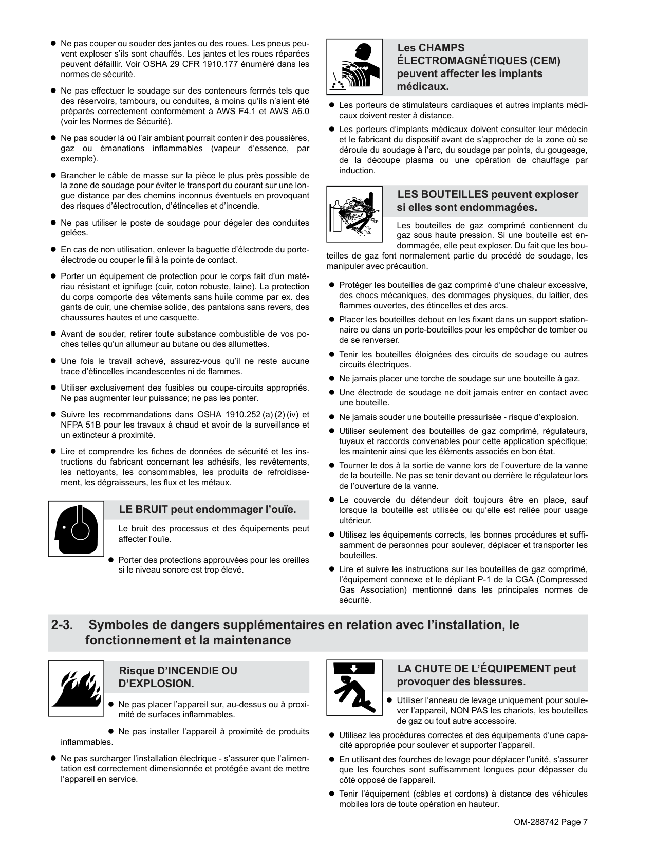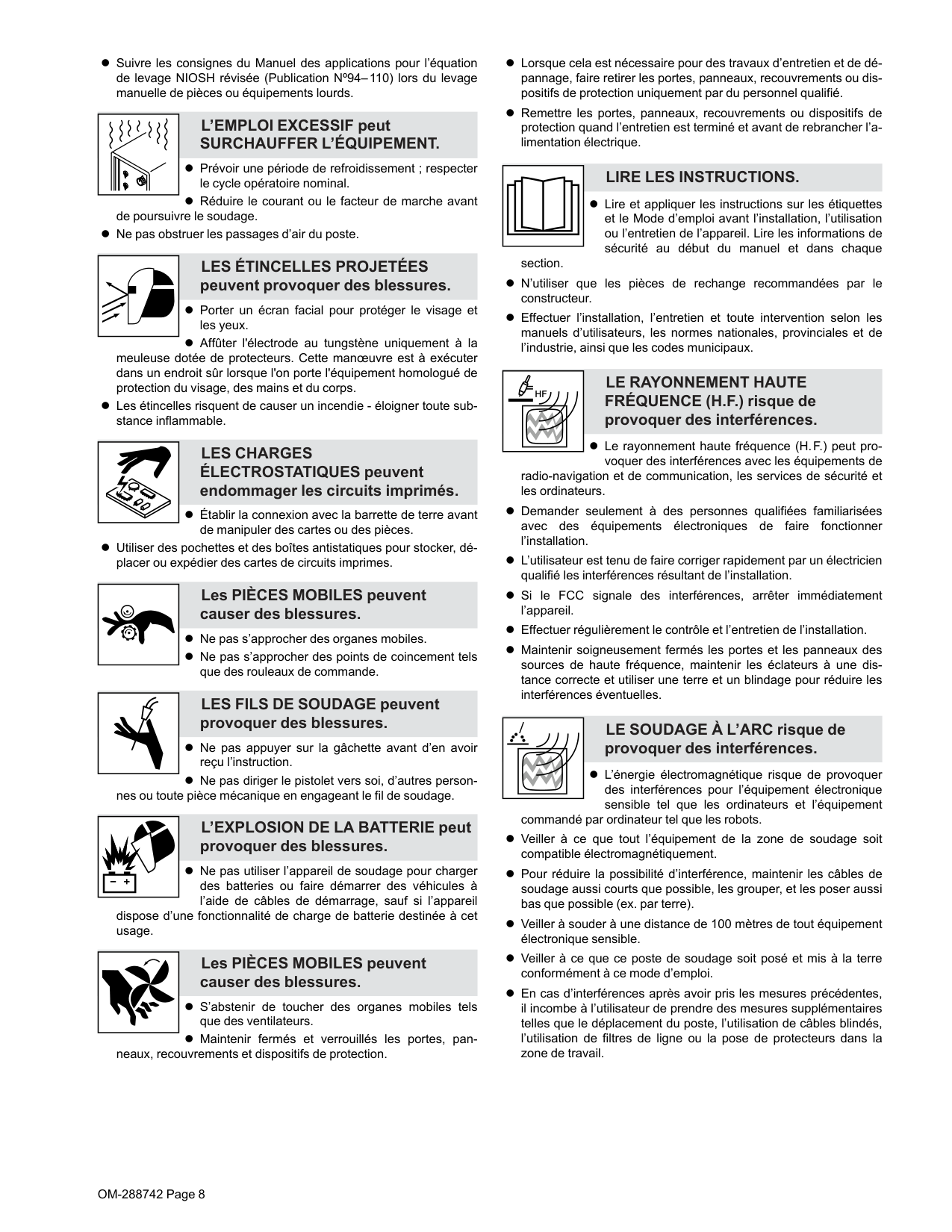 l Ne pas placer l’appareil sur, au-dessus ou à proxi- mité de surfaces inflammables. l Ne pas installer l’appareil à proximité de produits inflammables. l Ne pas surcharger l’installation électrique - s’assurer que l’alimen- tation est correctement dimensionnée et protégée avant de mettre l’appareil en service. LA CHUTE DE L’ÉQUIPEMENT peut provoquer des blessures. l Utiliser l’anneau de levage uniquement pour soule- ver l’appareil, NON PAS les chariots, les bouteilles de gaz ou tout autre accessoire. l Utilisez les procédures correctes et des équipements d’une capa- cité appropriée pour soulever et supporter l’appareil. l En utilisant des fourches de levage pour déplacer l’unité, s’assurer que les fourches sont suffisamment longues pour dépasser du côté opposé de l’appareil. l Tenir l’équipement (câbles et cordons) à distance des véhicules mobiles lors de toute opération en hauteur.OM-288742 Page 8 l Suivre les consignes du Manuel des applications pour l’équation de levage NIOSH révisée (Publication Nº94–110) lors du levage manuelle de pièces ou équipements lourds. L’EMPLOI EXCESSIF peut