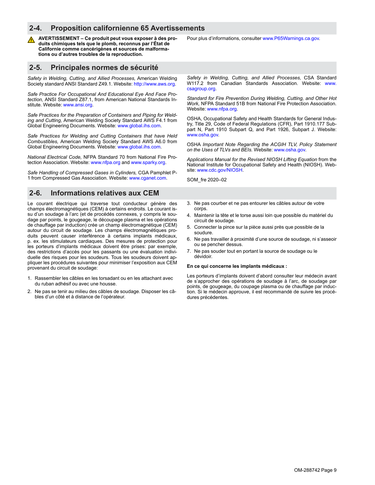 FRÉQUENCE (H.F.) risque de provoquer des interférences. l Le rayonnement haute fréquence (H.F.) peut pro- voquer des interférences avec les équipements de radio-navigation et de communication, les services de sécurité et les ordinateurs. l Demander seulement à des personnes qualifiées familiarisées avec des équipements électroniques de faire fonctionner l’installation. l L’utilisateur est tenu de faire corriger rapidement par un électricien qualifié les interférences résultant de l’installation. l Si le FCC signale des interférences, arrêter immédiatement l’appareil. l Effectuer régulièrement le contrôle et l’entretien de l’installation. l Maintenir soigneusement fermés les portes et les panneaux des sources de haute fréquence, maintenir les éclateurs à une dis- tance correcte et utiliser une terre et un blindage pour réduire les interférences éventuelles. LE SOUDAGE À L’ARC risque de provoquer des interférences. l L’énergie électromagnétique risque de provoquer des interférences pour l’équipement électronique sensible tel que les ordinateurs et l’équipement commandé par ordinateur tel que les robots. l Veiller à ce que tout l’équipement de la zone de soudage soit compatible électromagnétiquement. l Pour réduire la possibilité d’interférence, maintenir les câbles de soudage aussi courts que possible, les grouper, et les poser aussi bas que possible (ex. par terre). l Veiller à souder à une distance de 100 mètres de tout équipement électronique sensible. l Veiller à ce que ce poste de soudage soit posé et mis à la terre conformément à ce mode d’emploi. l En cas d’interférences après avoir pris les mesures précédentes, il incombe à l’utilisateur de prendre des mesures supplémentaires telles que le déplacement du poste, l’utilisation de câbles blindés, l’utilisation de filtres de ligne ou la pose de protecteurs dans la zone de travail.OM-288742 Page 9 2-4. Proposition californienne 65 Avertissements AVERTISSEMENT – Ce produit peut vous exposer à des pro- duits chimiques tels que le plomb, reconnus par l’État de Californie comme cancérigènes et sources de malforma- tions ou d’autres troubles de la reproduction. Pour plus d’informations, consulter www.P65Warnings.ca.gov. 2-5. Principales normes de sécurité Safety in Welding, Cutting, and Allied Processes, American Welding Society standard ANSI Standard Z49.1. Website: http://www.aws.org. Safe Practice For Occupational And Educational Eye And Face Pro- tection, ANSI Standard Z87.1, from American National Standards In- stitute. Website: www.ansi.org. Safe Practices for the Preparation of Containers and Piping for Weld- ing and Cutting, American Welding Society Standard AWS F4.1 from Global Engineering Documents. Website: www.global.ihs.com. Safe Practices for Welding and Cutting Containers that have Held Combustibles, American Welding Society Standard AWS A6.0 from Global Engineering Documents. Website: www.global.ihs.com. National Electrical Code, NFPA Standard 70 from National Fire Pro- tection Association. Website: www.nfpa.org and www.sparky.org. Safe Handling of Compressed Gases in Cylinders, CGA Pamphlet P- 1 from Compressed Gas Association. Website: www.cganet.com. Safety in Welding, Cutting, and Allied Processes, CSA Standard W117.2 from Canadian Standards Association. Website: www. csagroup.org. Standard for Fire Prevention During Welding, Cutting, and Other Hot Work, NFPA Standard 51B from National Fire Protection Association. Website: www.nfpa.org. OSHA, Occupational Safety and Health Standards for General Indus- try, Title 29, Code of Federal Regulations (CFR), Part 1910.177 Sub- part N, Part 1910 Subpart Q, and Part 1926, Subpart J. Website: www.osha.gov. OSHA Important Note Regarding the ACGIH TLV, Policy Statement on the Uses of TLVs and BEIs. Website: www.osha.gov. Applications Manual for the Revised NIOSH Lifting Equation from the National Institute for Occupational Safety and Health (NIOSH). Web- site: www.cdc.gov/NIOSH. SOM_fre 2020–02 2-6. Informations relatives aux CEM Le courant électrique qui traverse tout conducteur génère des champs électromagnétiques (CEM) à certains endroits. Le courant is- su d’un soudage à l’arc (et de procédés connexes, y compris le sou- dage par points, le gougeage, le découpage plasma et les opérations de chauffage par induction) crée un champ électromagnétique (CEM) autour du circuit de soudage. Les champs électromagnétiques pro- duits peuvent causer interférence à certains implants médicaux, p. ex. les stimulateurs cardiaques. Des mesures de protection pour les porteurs d’implants médicaux doivent être prises: par exemple, des restrictions d’accès pour les passants ou une évaluation indivi- duelle des risques pour les soudeurs. Tous les soudeurs doivent ap- pliquer les procédures suivantes pour minimiser l’exposition aux CEM provenant du circuit de soudage: