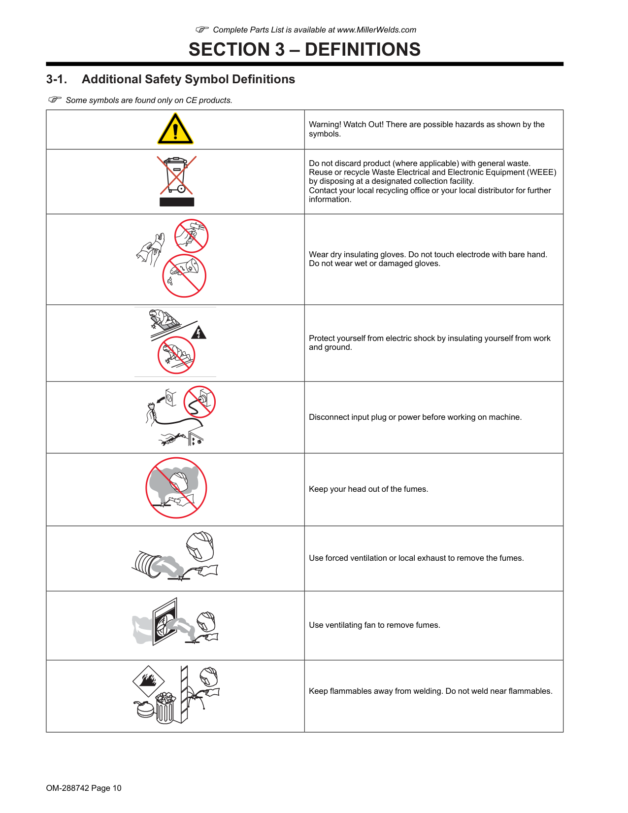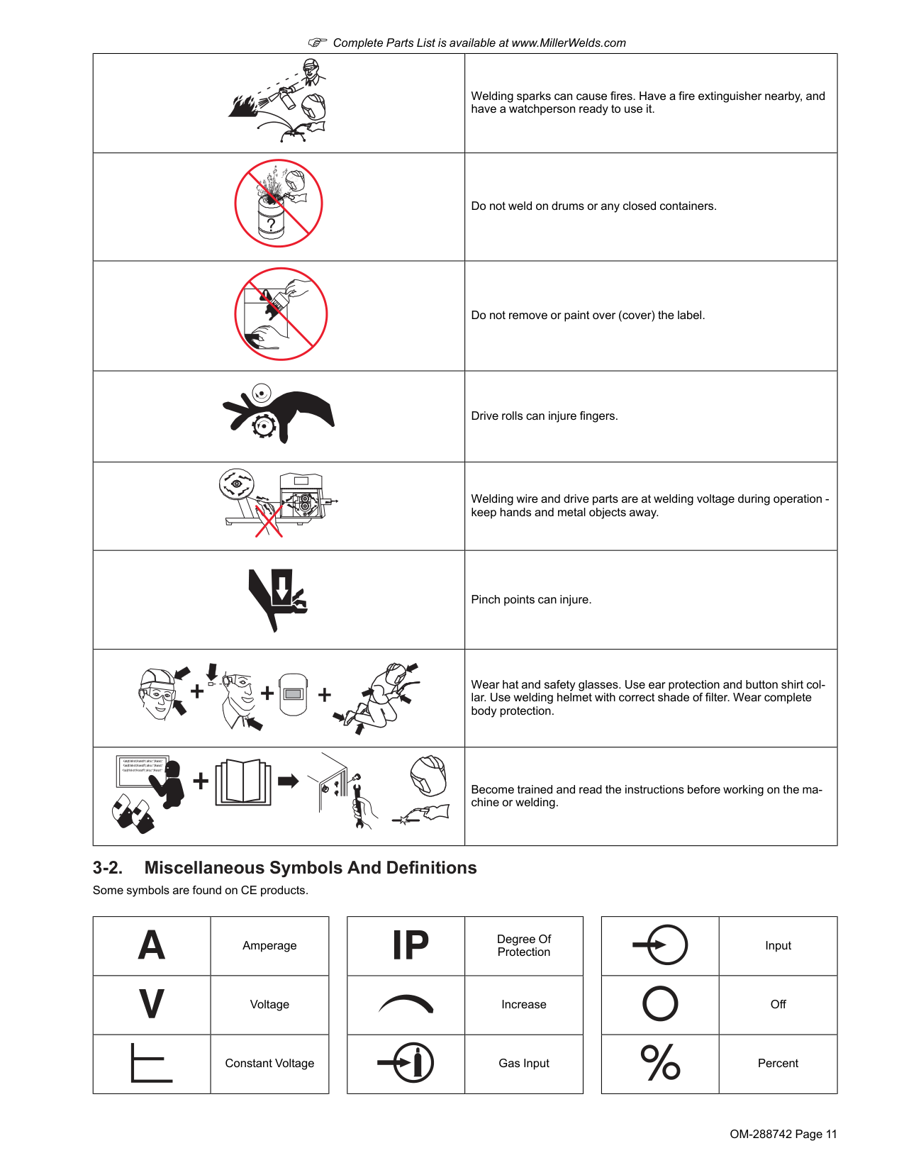 3-1. Additional Safety Symbol Definitions F Some symbols are found only on CE products. Warning! Watch Out! There are possible hazards as shown by the symbols. Do not discard product (where applicable) with general waste. Reuse or recycle Waste Electrical and Electronic Equipment (WEEE) by disposing at a designated collection facility. Contact your local recycling office or your local distributor for further information. Wear dry insulating gloves. Do not touch electrode with bare hand. Do not wear wet or damaged gloves. Protect yourself from electric shock by insulating yourself from work and ground. Disconnect input plug or power before working on machine. Keep your head out of the fumes. Use forced ventilation or local exhaust to remove the fumes. Use ventilating fan to remove fumes. Keep flammables away from welding. Do not weld near flammables.OM-288742 Page 11 F Complete Parts List is available at www.MillerWelds.com Welding sparks can cause fires. Have a fire extinguisher nearby, and have a watchperson ready to use it. Do not weld on drums or any closed containers. Do not remove or paint over (cover) the label. Drive rolls can injure fingers. Welding wire and drive parts are at welding voltage during operation - keep hands and metal objects away. Pinch points can injure. Wear hat and safety glasses. Use ear protection and button shirt col- lar. Use welding helmet with correct shade of filter. Wear complete body protection. Become trained and read the instructions before working on the ma- chine or welding. 3-2. Miscellaneous Symbols And Definitions Some symbols are found on CE products. Amperage Voltage Constant Voltage Degree Of Protection Increase Gas Input Input Off Percent
